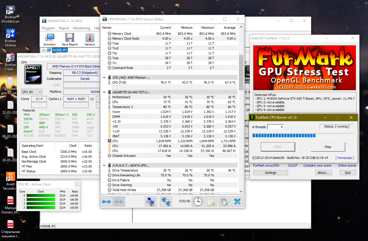 Прогнал FurMark Burner и Linx. Получил 79° максимум, 78° постоянно (ну те 3 минуты которые гонял) и 80° в потолке после чего идет сброс с 3,2 до 800. После снижения температуры до 78° (секунд 10) снова выходит на полные 3,2. p.s. под нагрузкой комп дает не хилый такой фон работающему в соседней комнате FM радио