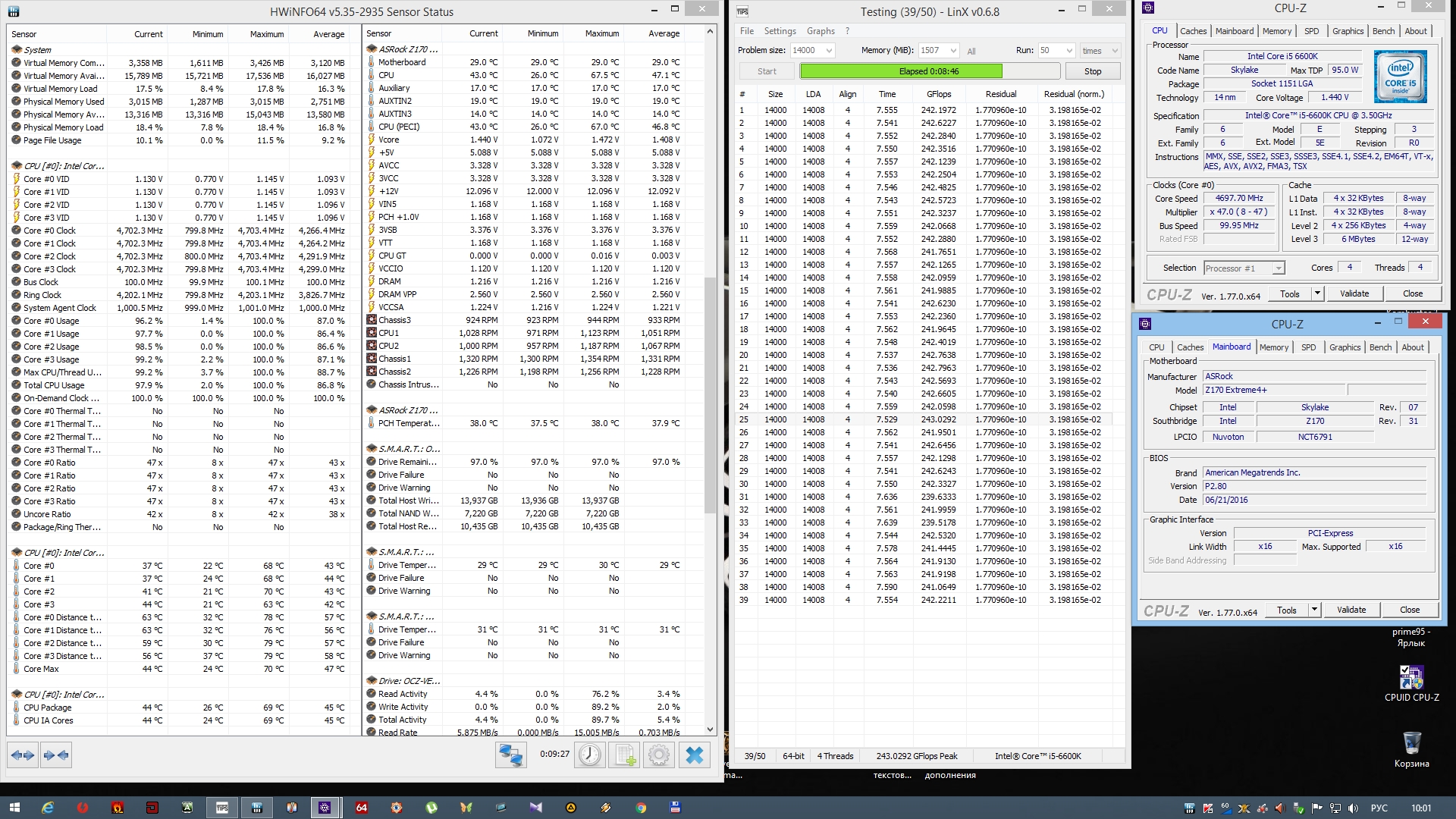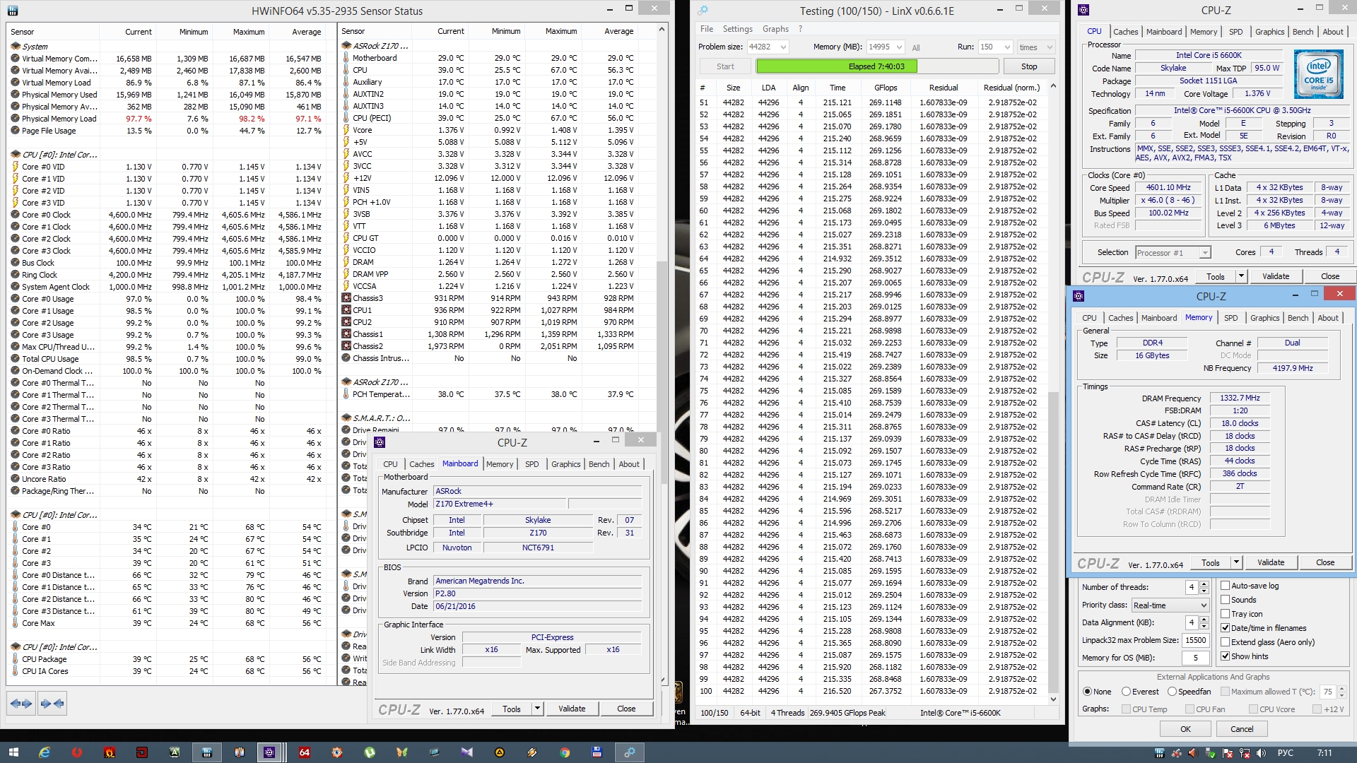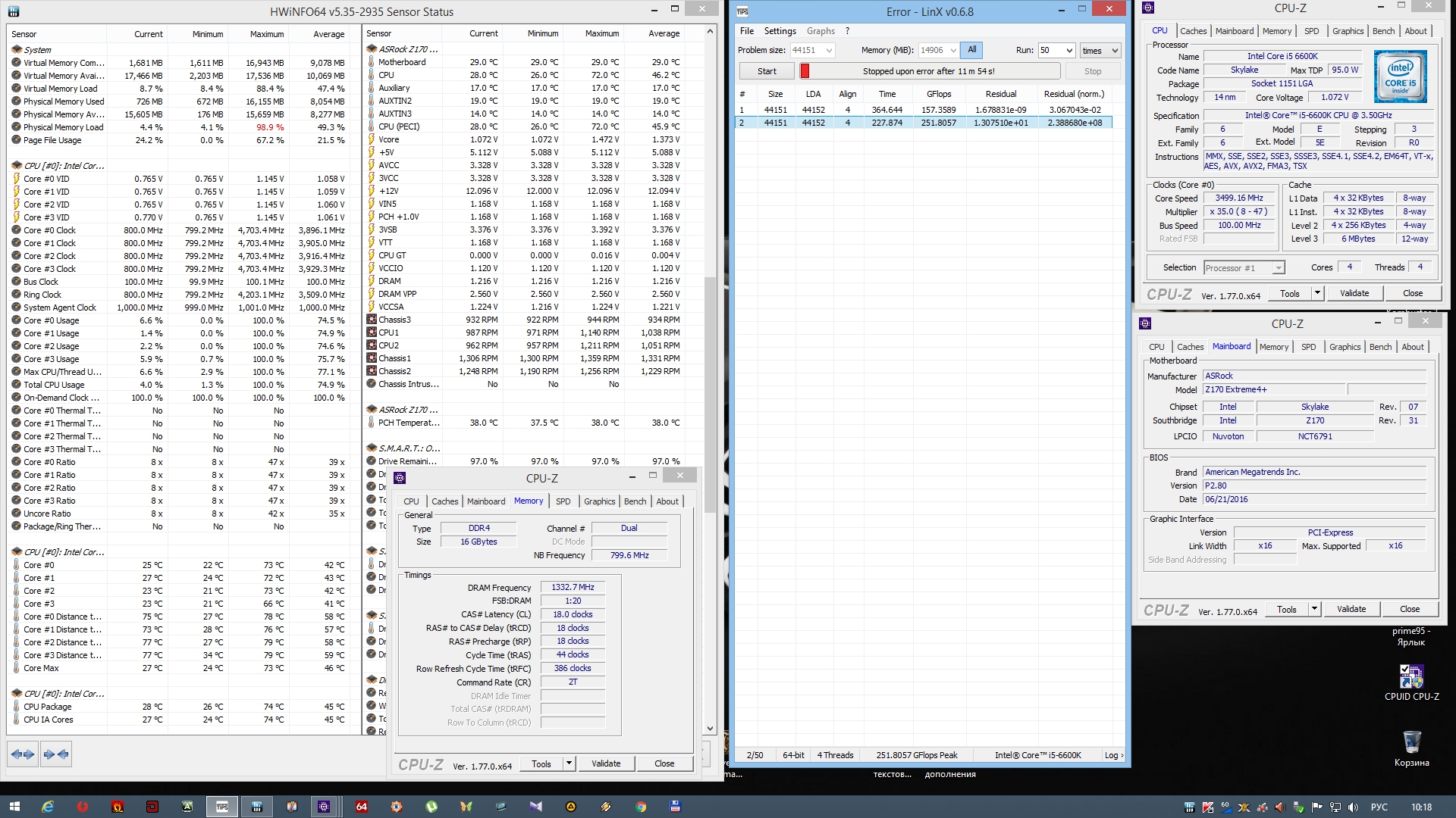 А теперь у меня вопрос на засыпку: Никто не сталкивался с расхождениями Residual в LinX под Win10 x64 в стоке? Есть сборка i7-6700k + Asus Z170-A, в Win7 в LinX любой версии стабильность 100%, во всех строчках числа в столбцах Residual совпадают в Win10 в LinX любой версии (0.6.5 и выше) проходит без сообщений об ошибках, но иногда проскакивают разные числа в столбцах Residual При этом проверено: сбросил весь разгон, заменил проц на другой (3 или 4 разных 6700K проверил), заменил мат плату на другую такую же, проверял с 3 разными комплектами памяти, расхождения появляются чаще или реже, но есть всегда при достаточно длительном и тяжелом тестировании. При этом последнюю версию Prime95 крутит 7 часов без ошибок. Win 7 x64 linx OK: #77 Win10 x64 LinX с расхождением Residual: #77 Win10 x64 prime95 7 часов OK: #77