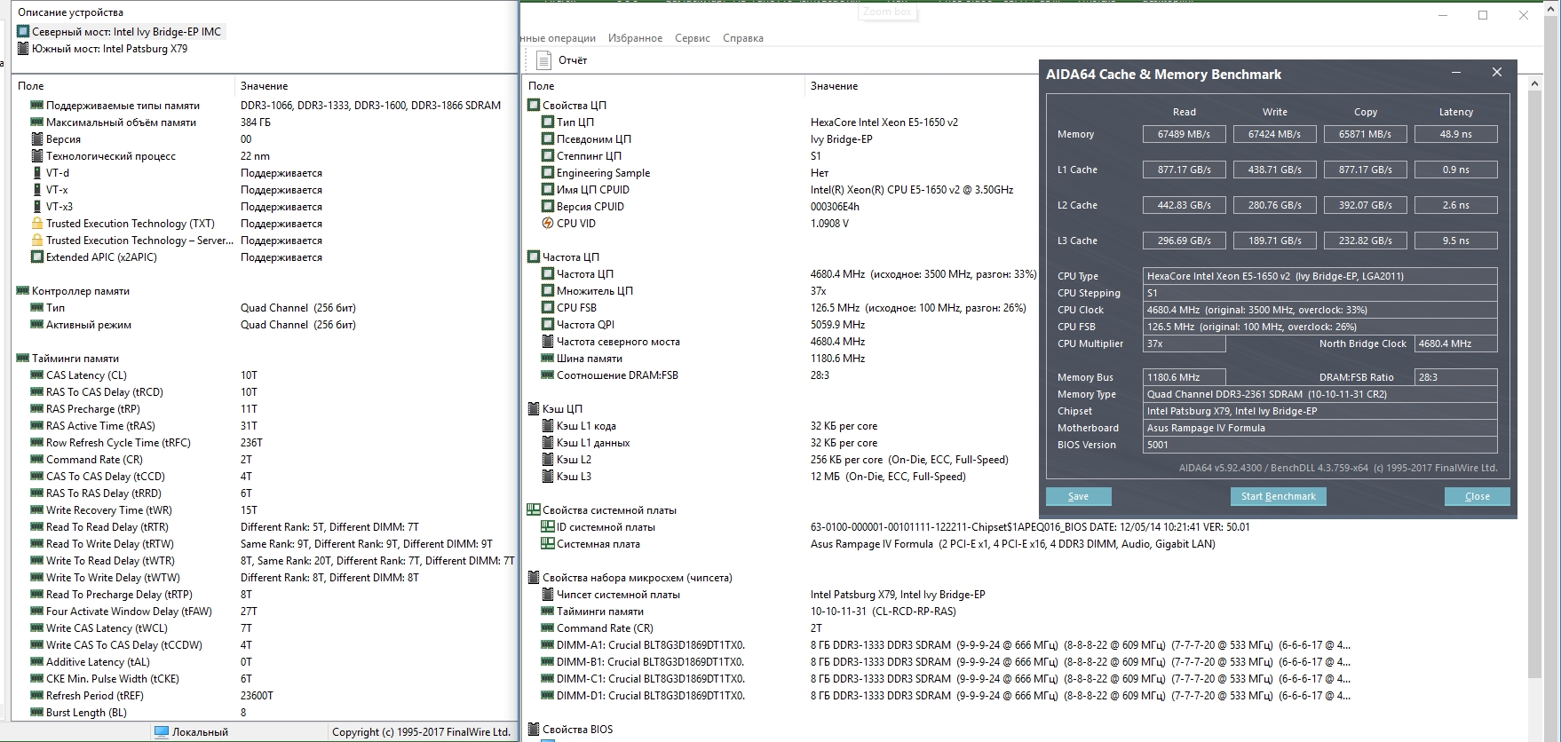 А, что с показателями не так? 1680v2 работает на частоте 4.45ГГц и памяти 2520МГц, кеш большой (и быстрый). Поэтому и показатели равны 2690 v2 на частоте 3.75ГГц по всем ядрам. Конечно аида кажет максимальную частоту на одно ядро в турбобусте. Но во время теста частоты соответствуют тубобусту 1, то бишь 3.75ГГц