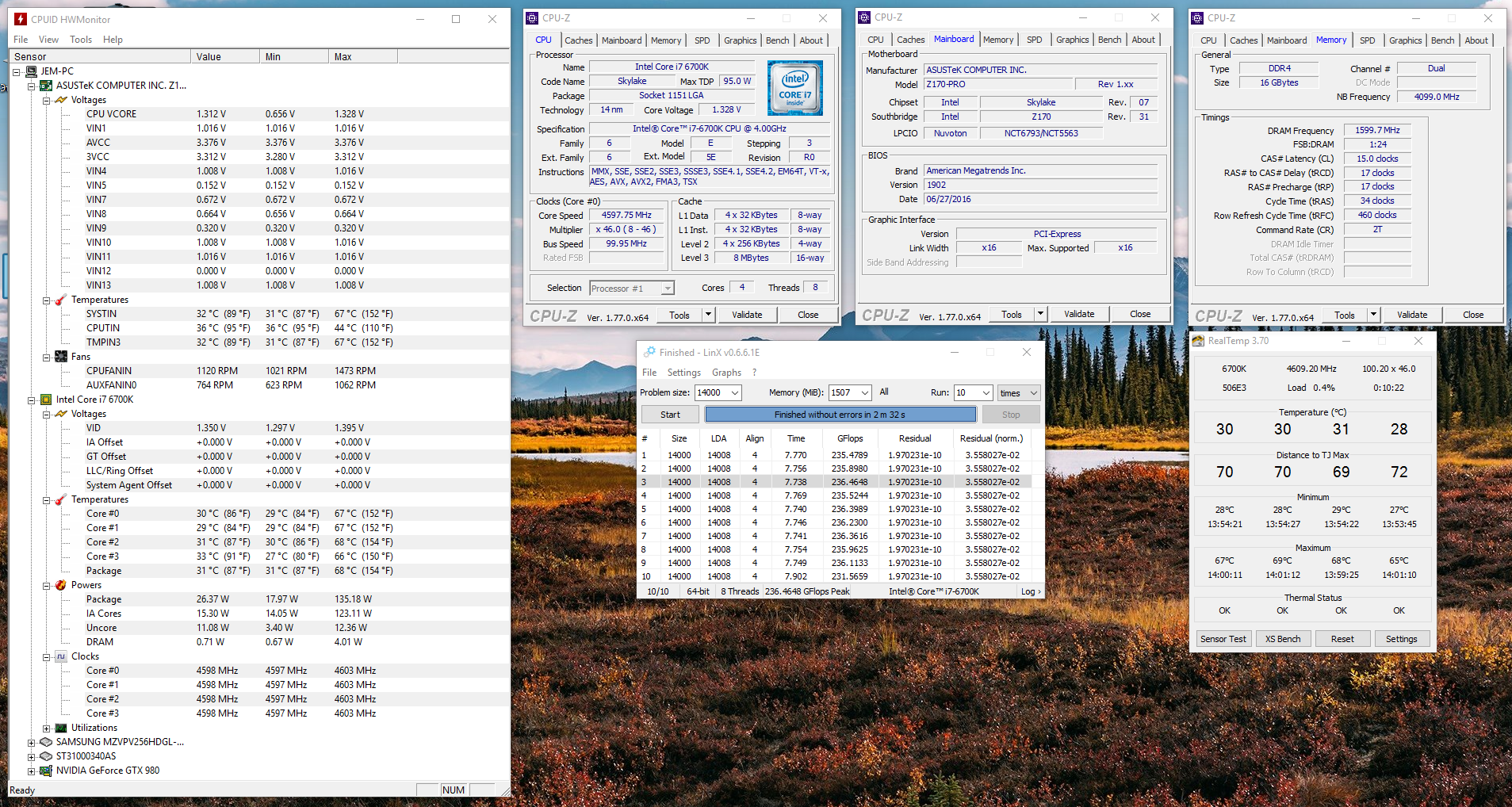 Давненько я тут не был, пару лет уже Собрал себе новую систему на z-170, хочу поделиться результатами разгона 6700К. За цель поставил себе частоту 4600 МГц. До скальпа все было очень печально, несмотря на все ковыряния в биосе, пробовал разные варианты контроля напряжений, LLC и т.п. температура достигала 90-94°C на самом горячем ядре. Использовал СВО Cooler Master Seidon 120V VER.2, который остался от старой сборки.
