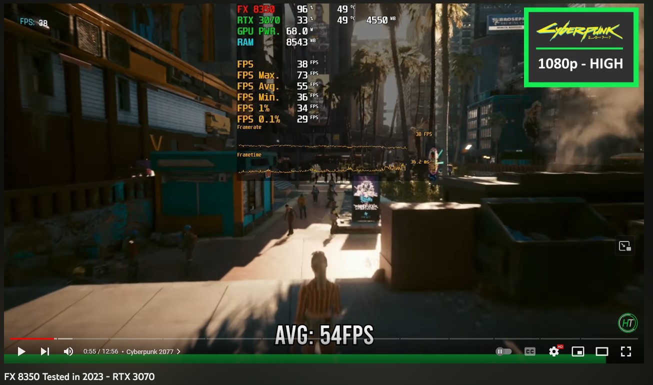 Видео теста FX 8350 + RTX 3070 (https://www.youtube.com/watch?v=sD4fGqQJkh8) Настройки 1920x1080, высокие, FSR Качество. Средний FPS 54. Ну и конкретно кадр из самого тяжелого места. 38 ФПС на FX. Загрузка камня 96%, он больше выдать не может.