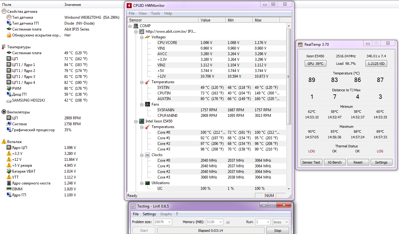 ROLtd Температура на скринах удивляет, либо некорректные данные, либо процу явно душно. Вентиль на цпу на 3000 об. это что-то . Надо бы вентиляцию корпуса продумать.