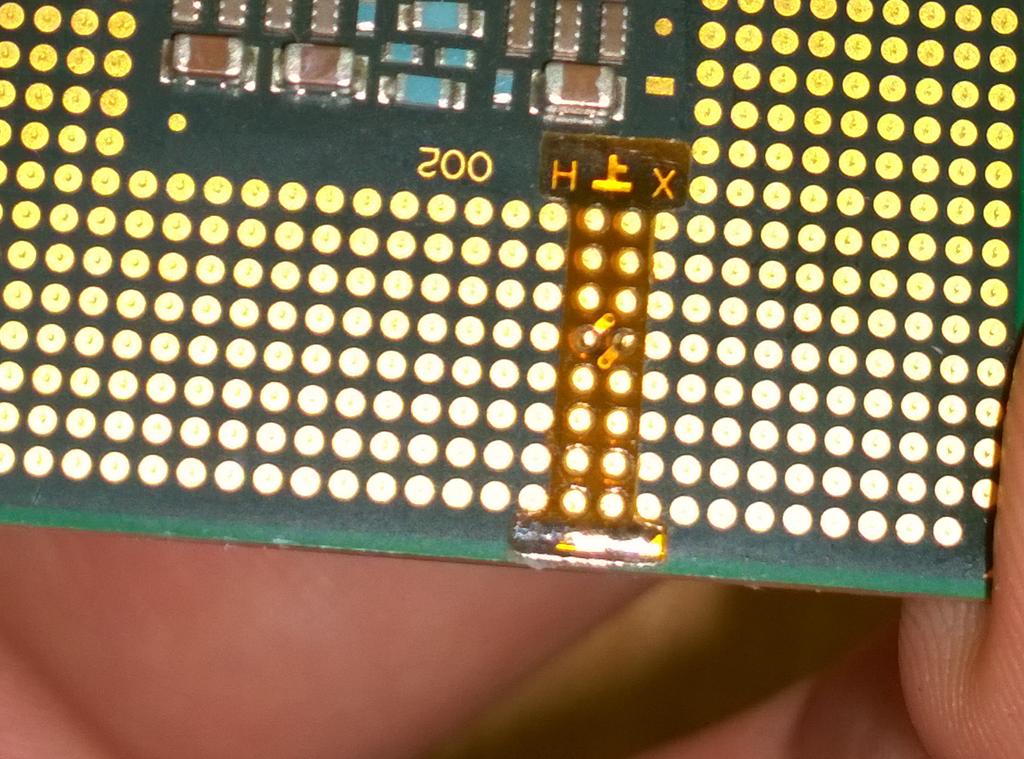 День добрый, поделюсь своим опытом установки E5450, заказал на али камень, пришел с 2 наклейками (не наклеиными на проц), но уже с пропилами и пропилы были подозрительного синего цвета , наклеил наклейку установил в мать с мод биосом и тишина, только кулер на проце немного крутанул и всё. Попробывал другую наклейку тоже самое, стал рассматривать пропилы, взял спирт и начал их протирать , и оказалось что это просто маркер синего цвета. Вытер весь маркер, протер весь проц , опять наклеил старую наклейку и все сразу стартануло.