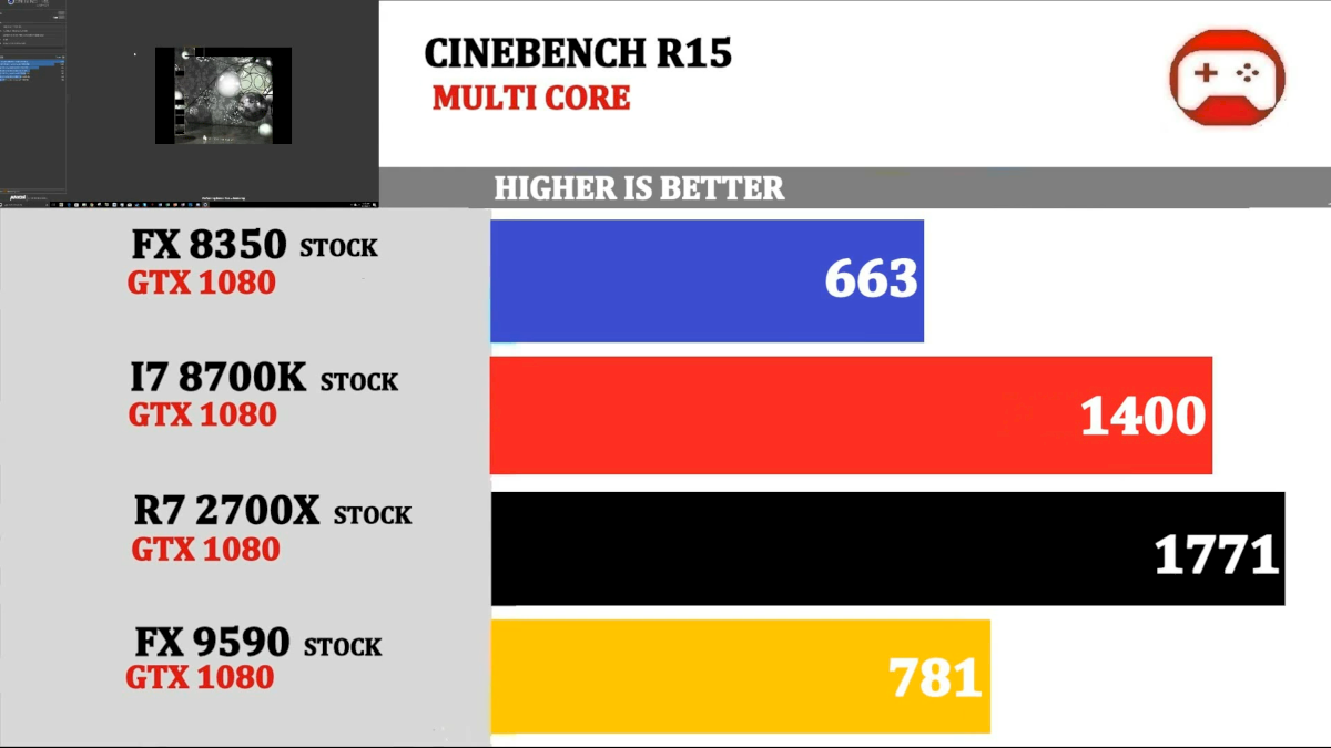 Cinebench R15. FX 8350 vs I7 8700K vs FX 9590 vs R7 2700X stock.