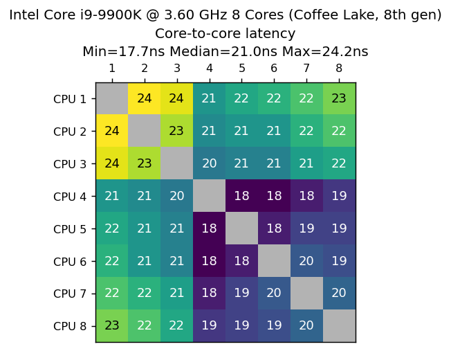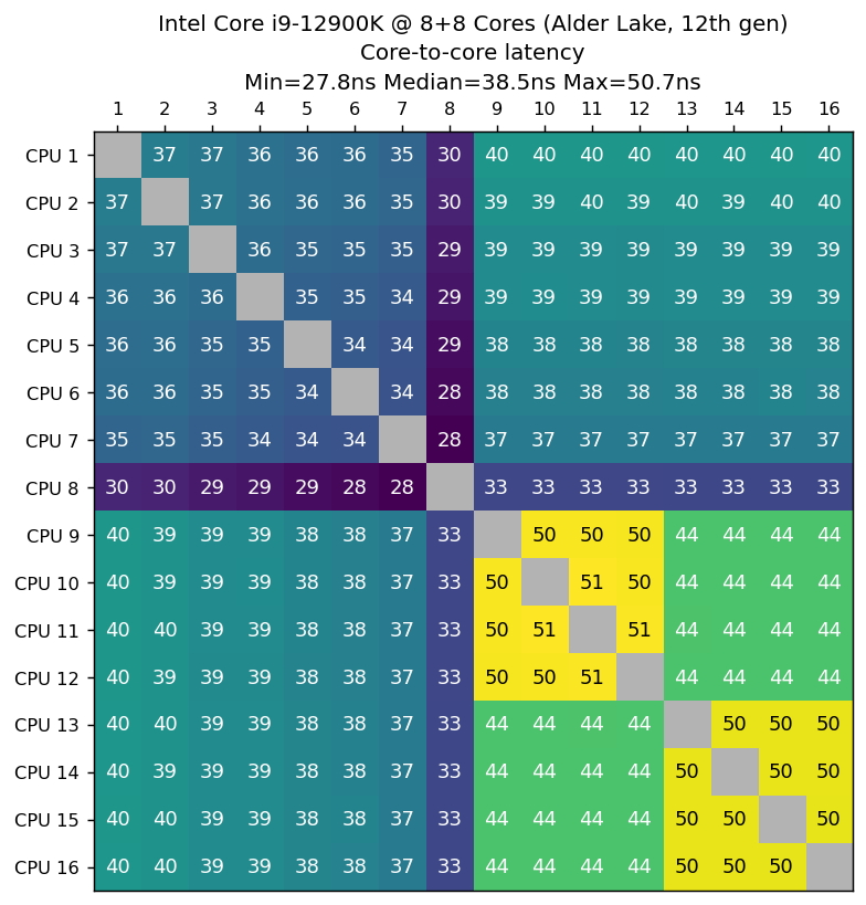 Я тут понял что для более точного измерения надо в утилите core to core latency указать дополнительные параметры сколько тестов делать, так получается средняя латентность(а не как у меня минимальная 27 и максимальная 52), на них виднее:
