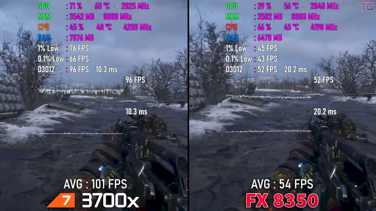 +10-30 FPS по среднему кадру. Причем FrameTime у FX ощутимо ровнее, не такой дерганый. Это "надругательство", только если ничего [более уничижительного, обидного] не получается придумать . Уже и райзены 1-го поколения не смогли "надругаться", и даже "какой-нибудь i3 четырехъядерный" едва смог с рваным Frametime.... Кто следующий на очереди? R5 5600? Если он - то [мы с FX-сом] сдаемся