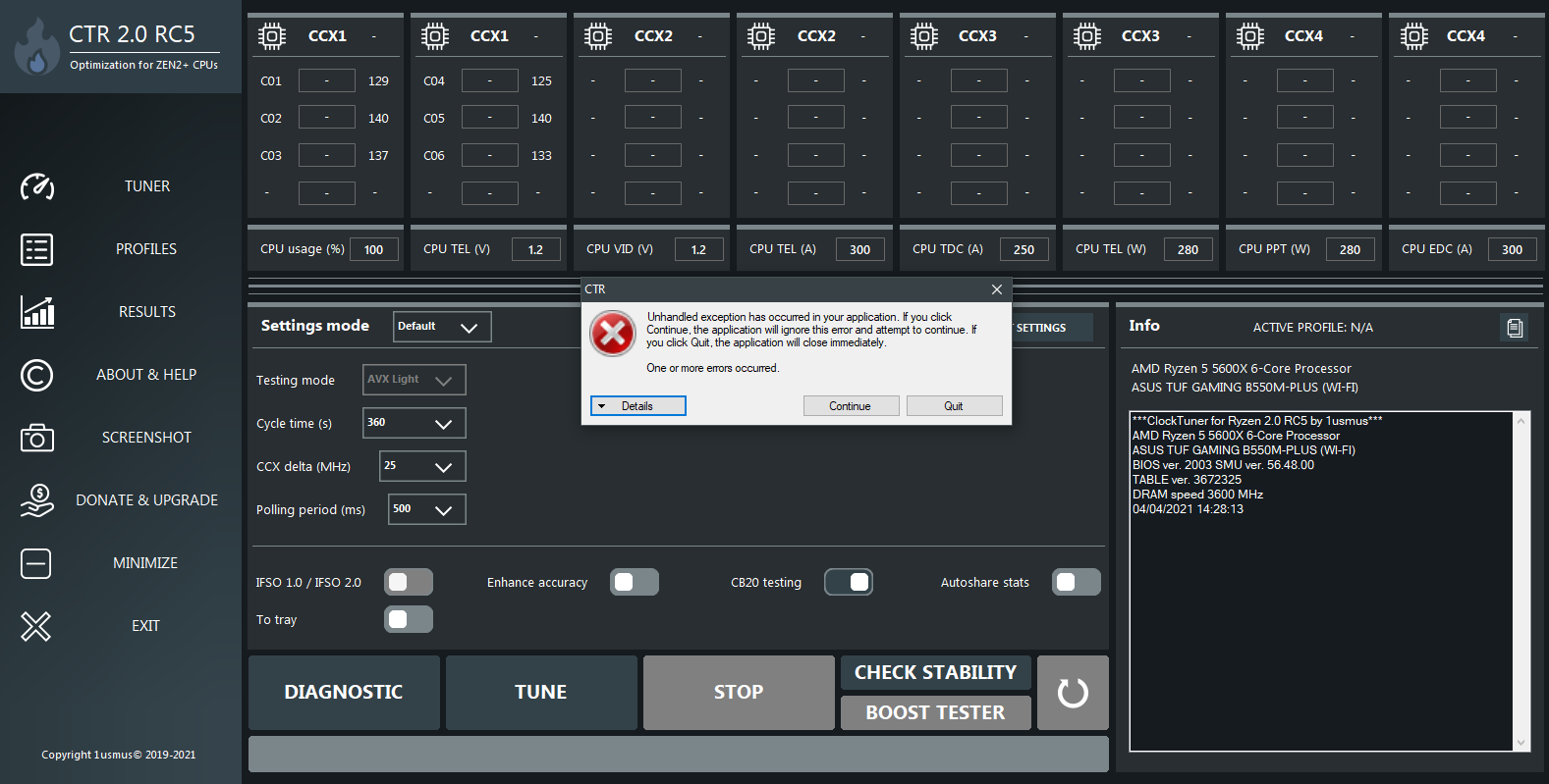 Проц 5600x ,мать TUF GAMING B550M-PLUS (WI-FI) ,не работает CTR2.0RC5 .Стоял r5 3600 все работало, поставил 5600x CTR запускается но не отображает частоты, температуру и т.п.(стоят прочерки) при запуске diagnostiс проходит тест в CIN20,сворачивает и всё, дальше никаких тестов не запускает. Tune запускает но все тесты проваливает. На кнопку Exit выдает ошибку "unhandled exception has occurred in your application..." . В меню info железо видит. Windows 10 переустановил , NET Framework 4.8 установлен, bios сток . Что может быть, почему не корректно работает с этим процем? И подскажите как скрины убрать под спойлер,не нашёл инфы ,сорян.