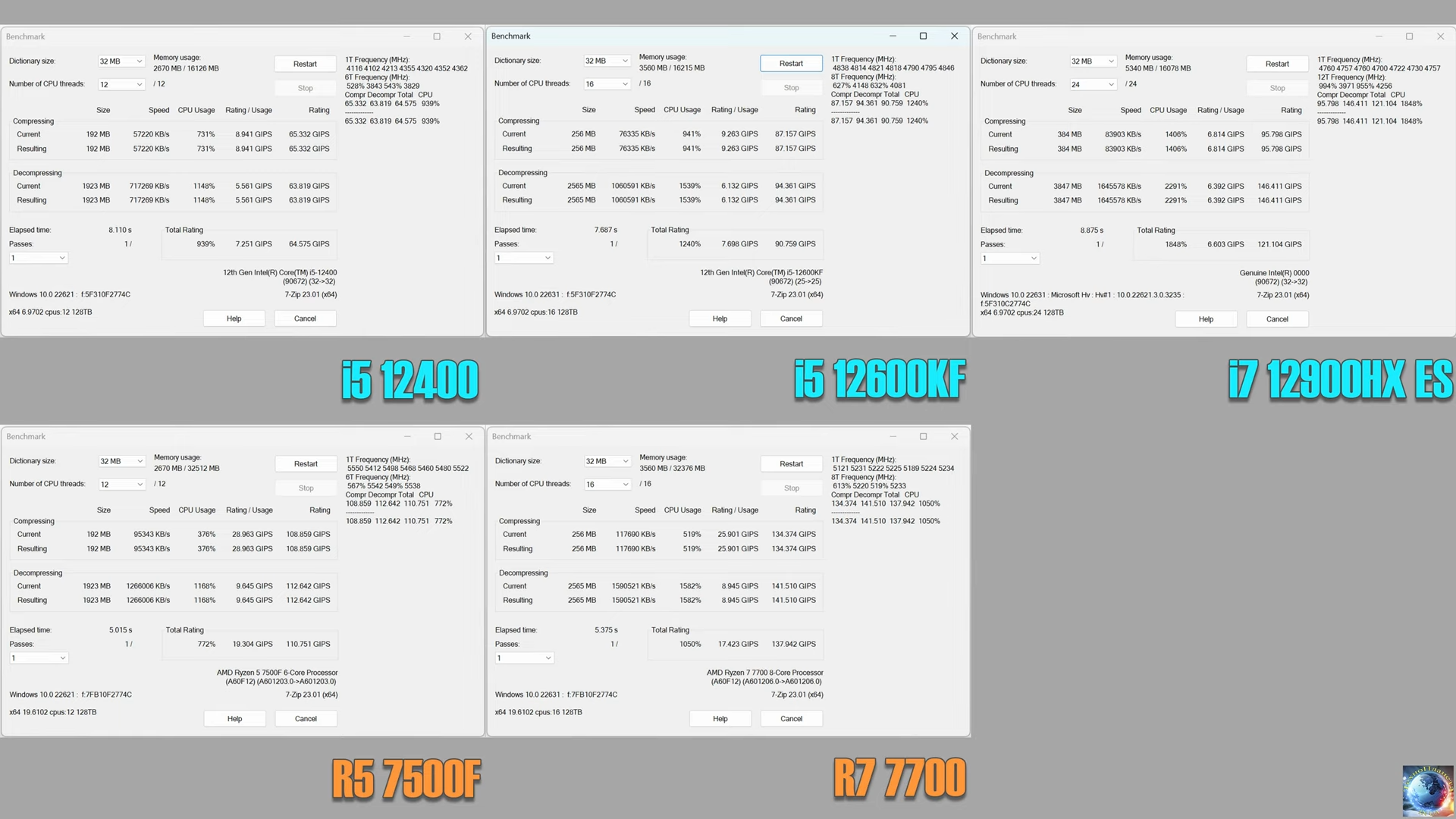 7-zip непонятно при каких условиях тестировались оба ЦП (там ОЗУ очень сильное влияние имеет, и даже версия windows - в 11-ой ЦП должны вести себя несколько иначе, потому что директор потоков ведет себя иначе)