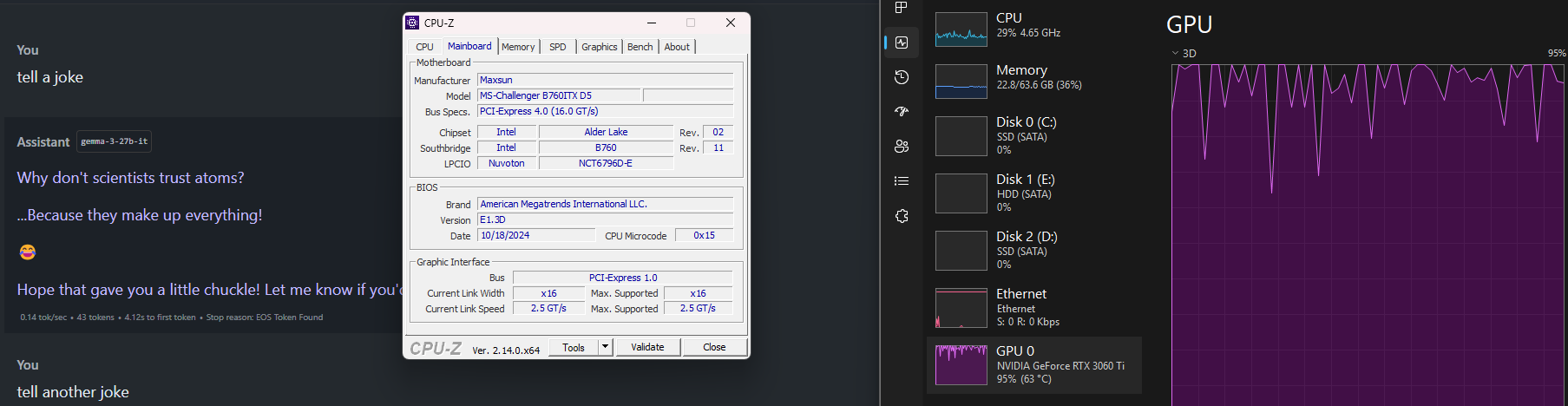 Разница 0.14 vs 2.13 токенов в с - это 15.2 раза. Загрузка шины PCI-E 4.0 - 90%. На 1.1 аналогичная загрузка Что касается AVX512 он даёт мне снижение потребления на 5% и снижение температуры на 3 градуса в идентичных задачах.