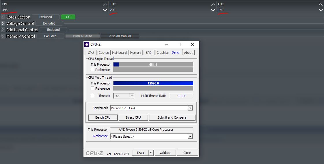При этом методе игнорируется лимит EDC, лимит TDC настраивается исходя из возможностей VRM, какой ток в амперах материнская плата может максимально выдать не перегревая VRM, лимит PPT это максимальное потребление процессора, особенно актуально если система охлаждения очень инертная. 5900X/5950X упрутся в температурный лимит в 90°С на самом горячем CCD, 5600X/5800X в 95°С, эти значения можно уменьшить при помощи настройки Platform Thermal Throttle Limit. Последние 5°С до этого лимита дают приличные пенальти к бусту.