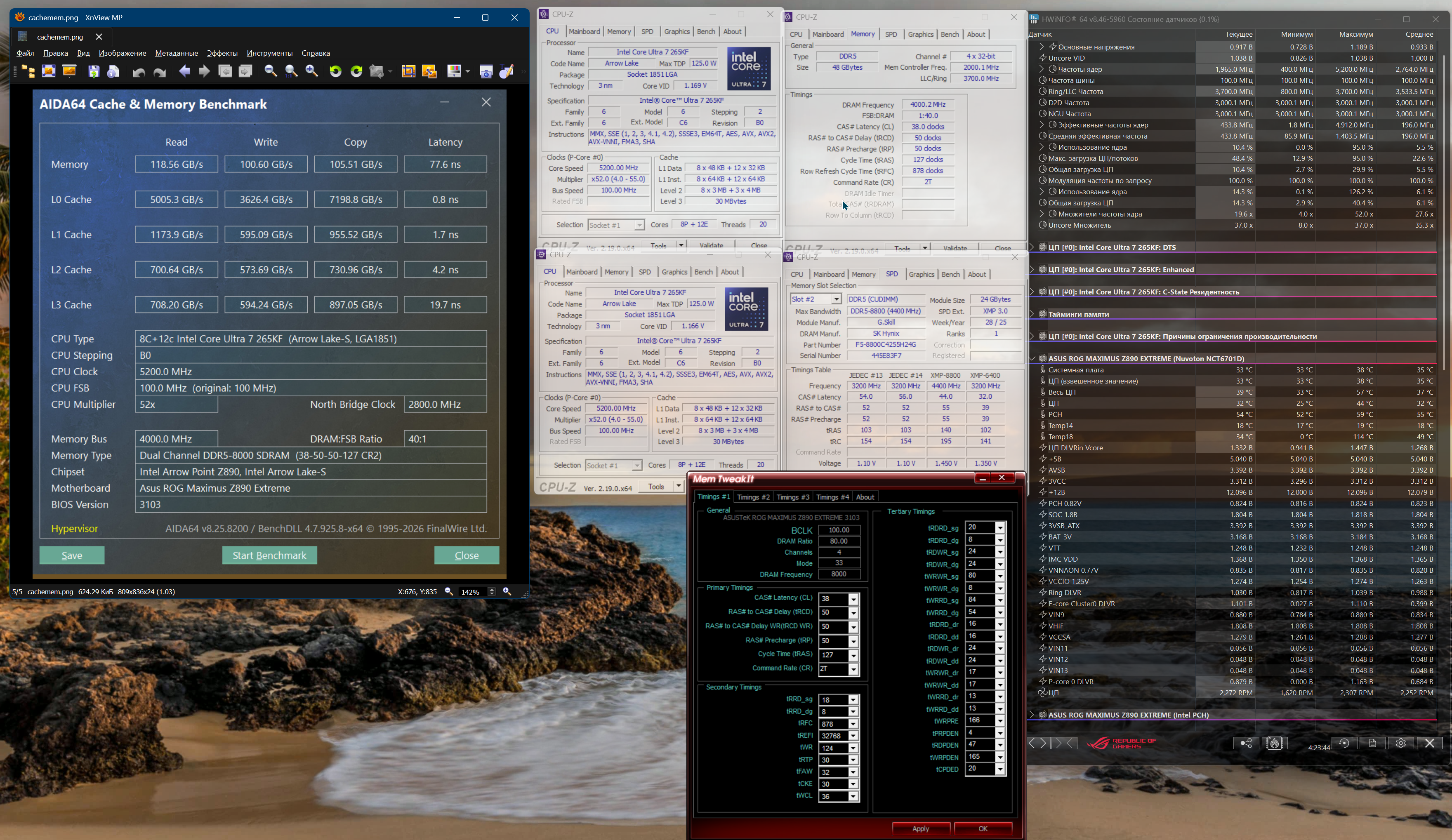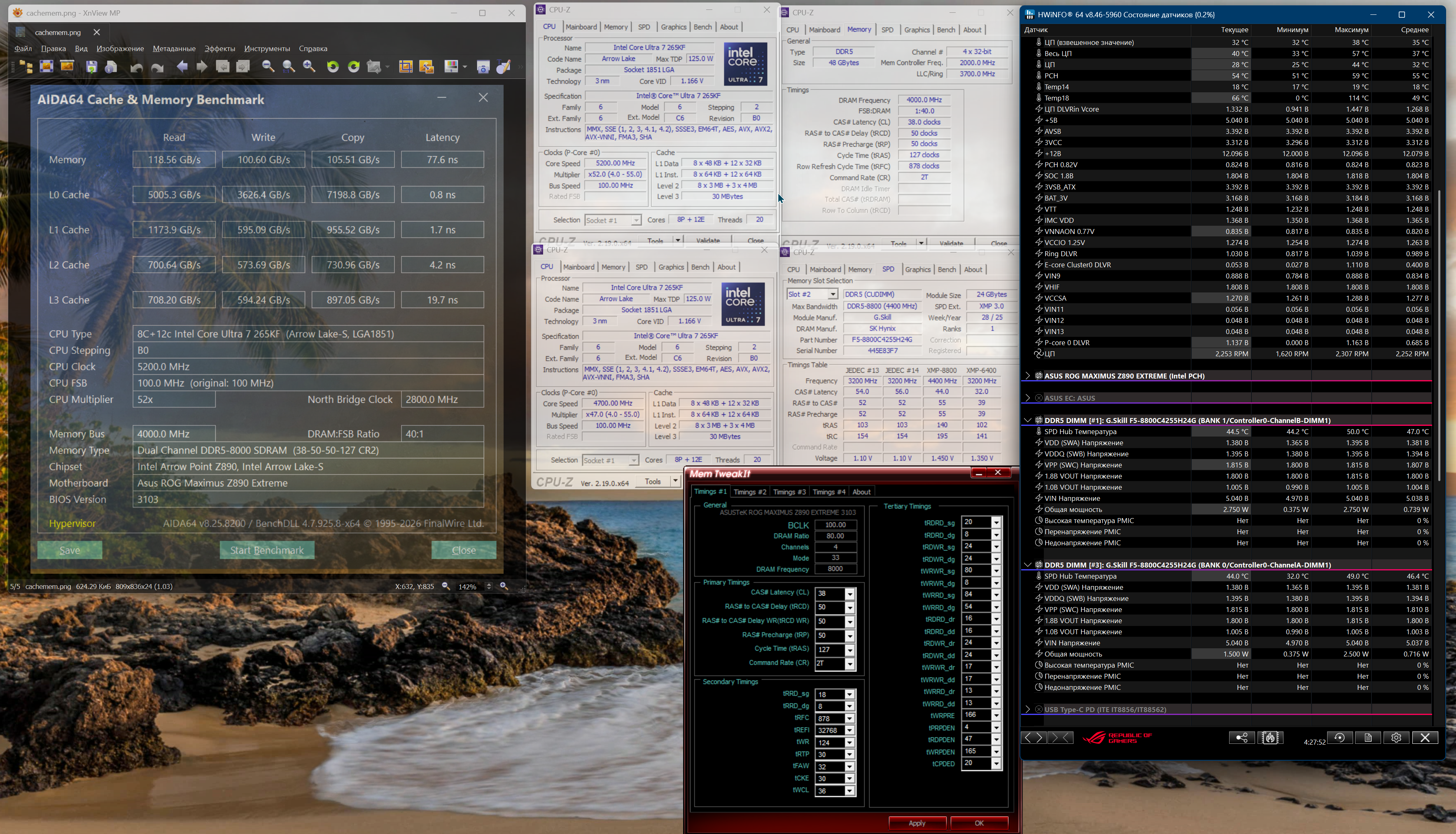 Хотел в альбом загрузить, но что-то не грузится. Потом закину. Отпишите видны картинки. Залил на обменник. Память у меня 8800 Кудим. В Биосе выставлен XMP Tweak. Есть два профиля 6400 и 8800. Тут практика показала, если выставляем 6400 и потом и ниже поднимаем до 8000, то ловим нестабильность. Выставлен сразу 8800, но ниже выставляю-понижаю до 8000. Сам ставлю Тайминги 38-50-50-50-127 (в Аиде посмотрел) и Трефи-32768 (ставит XMP Tweak). Также XMP Tweak выставляет автоматом (NGU + D2D)=32, но я понижаю оба значения до 30 ибо через несколько часов в Винде11 глюки (БСОДы). VNNAON с умолчания (0.781) выставляю в 0.82000. Напряжение на память и ниже (2 значения) с 1.45 (выставляется под 8800) ставлю оба в 1.38000. Я два месяца тестировал в поисках и дело это нудное. На картинке в АИДЕ снято 2 дня назад. Правда это уже с нагруженной Виндой. На чистой Винде будет 73-74 ns. Напруга на процессоре скачет от 0.9ххх до почти 1.4ххх (видно на фото). В Винде стоит режим - сбалансированный. Windows 11 24H2 IoT LTSC Enterprise (26100.8246) последняя апрельская заплатка. Вертушки на СЖО стоят бутербродом. 3 вертушки спереди, радиатор и 3 вертушки сзади (видно на фото). Температура при загрузки раб. стола под 50, но через минуту устаканивается под 36. Тест процессора CINEBENCH_(2025) и CINEBENCH_(2026) в районе 85 максимум. Праймом (Prime95) не гоняю. На 3м фото память в HWiNFO64 подснял ибо в предыдущем фото(2е) не поместилось.