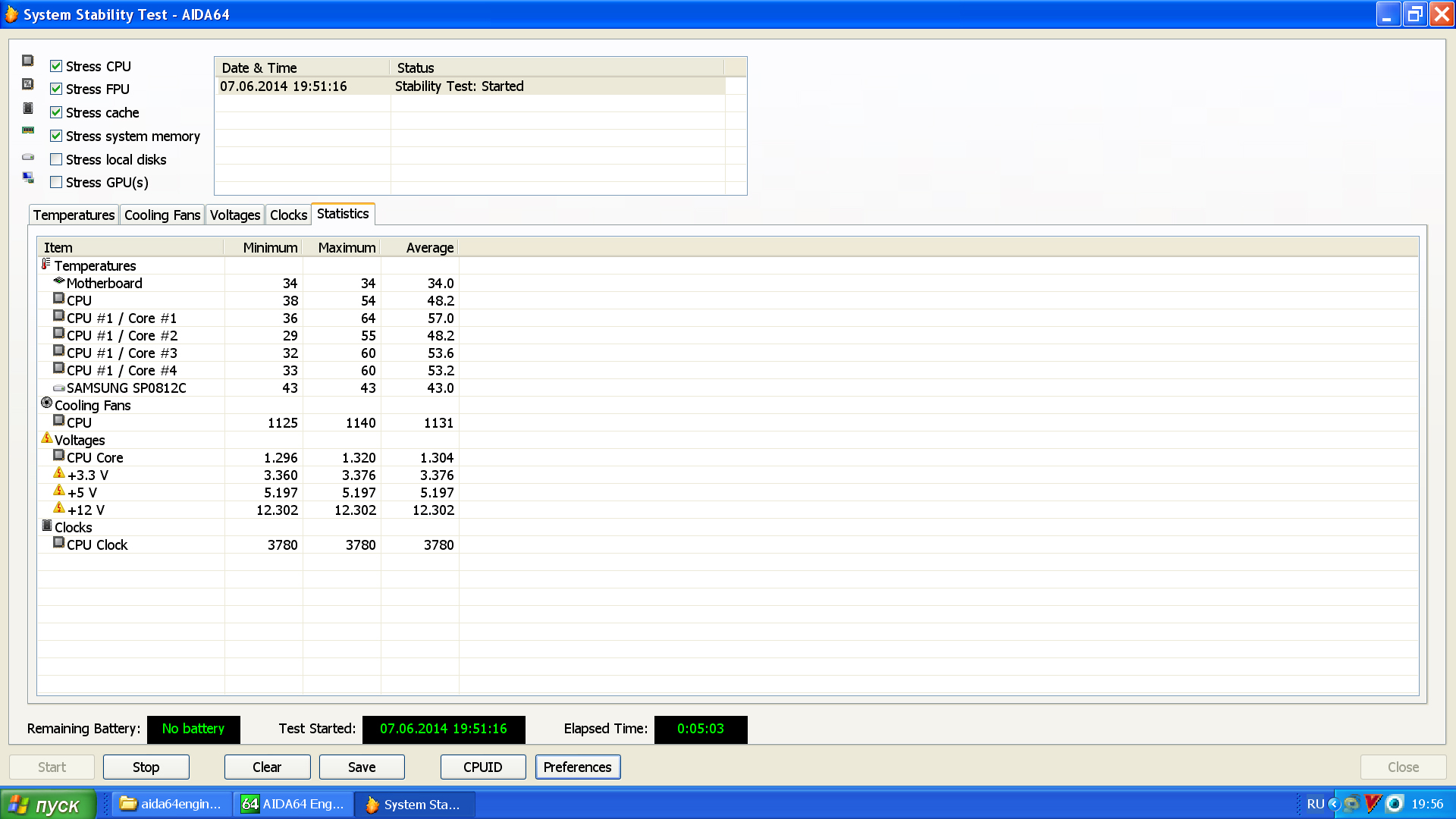 Тест стабильности aida64, боковая крышка открыта, системник без вытяжных вентиляторов, 3 винта разогретых до 50 градусов (это главный источник температуры и шума в системнике)