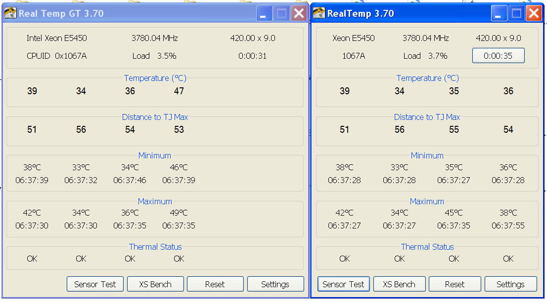 Посмотрел температуру своего l5420(без разгона) праведными прогами из ссылок выше (RMClock, Real Temp, CPU-Z) и офигел. Оказывается, что у меня температура по ядрам 60-70 градусов в простое.Цельсия.А в нагрузке до 80 и выше.Аида показывала соответственно ~35 и ~50 C. Кулер (Zalmun 7000B) старенький, еще даже без тепловых трубок, наощупь чуть теплый. Проверил ОССТ с мониторингом RMClock - тротлинга вроде нет..