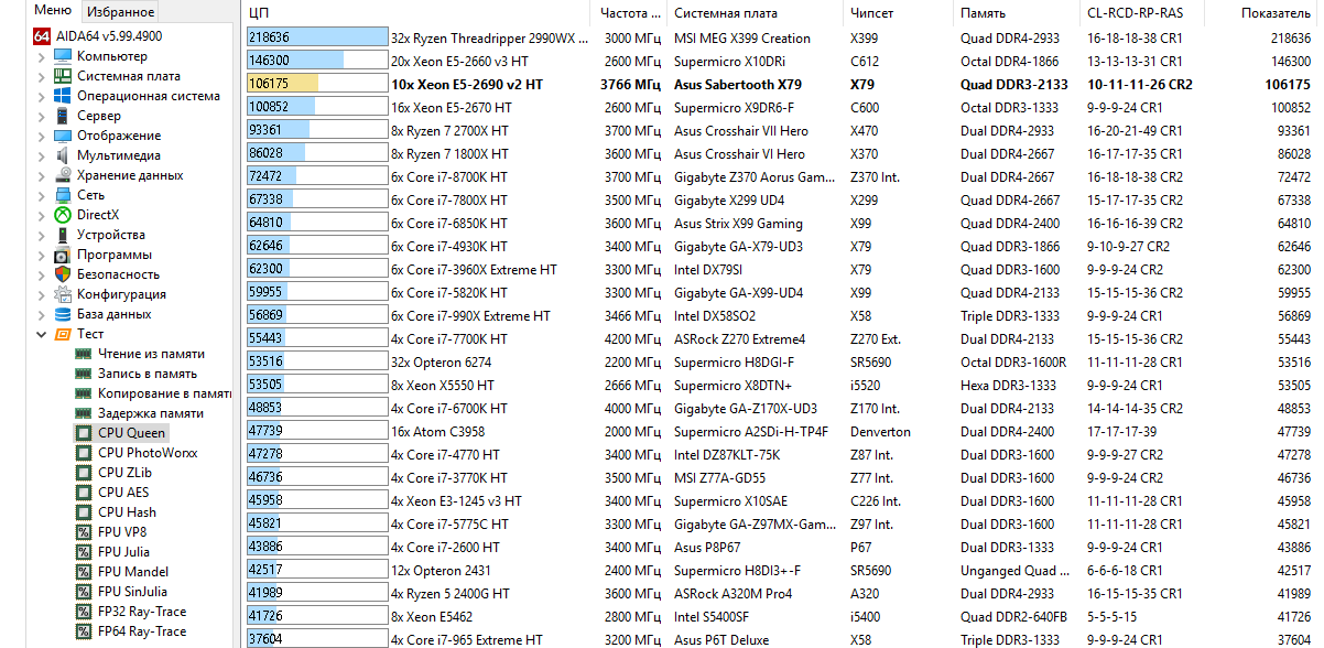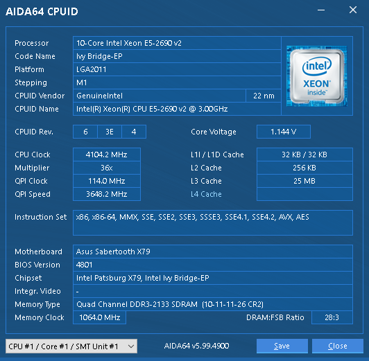 Может кому интересно:E5 2690v2 Разгон на материнской плате asus sabertooth x79 (биос 4801 модифицировал чтобы видел nvme) 33-36 х 114Mhz (3762-4104 Mhz) все ядра работают на 3762 Mhz (у некоторых частота вырастает в зависимости от нагрузки до 3876 (4 ядра) 3990 (2 ядра) 4104 (1 ядро), в простое частота падает до 1368 Mhz. Турбобуст включен. HT включен. Напряжение на процессор 1,14 вольта Дальнейшему разгону не поддается даже с повышение напряжения, предполагаю что залочено програмно в самом процессоре (у всех на брендовых материнках гонится до 114 по шине, при 114,1 не грузится) Процессор под разгоном остается холодным (при стресс тесте на CPU под Noctua D15 максимальная температура ядер 52-55 гр.). оператива 2133 Mhz(10-11-11-26 т2) 8гб х 4 шт. В биосе есть возможность выставить и выше герцовку но у меня не загрузилось (не знаю в чем ограничение в оперативной памяти или в процессоре) Разгон полностью стабилен. За два года что у меня этот компьютер (игры,Autodesk_Inventor), ни одного сброса. Сейчас в паре с 2080 RTX Aorus extreme. В играх при разрешениях 2к, 4к в легкую загружает видяху на 100% Во вложениях результаты синтетики AIDA64, CPU-Z, CINEBERNCH R15. p.s. Изначально были мысли поменять систему на что современнее i9 9900k или i7 9700 так как опасался что упрусь в процессор при замене ВК и переходе с full HD на 3440х1440. Но по факту оказалось что это бесмысленно, т.к. и сейчас система в играх более чем достойно себя ведет. Про профи программы вообще молчу.