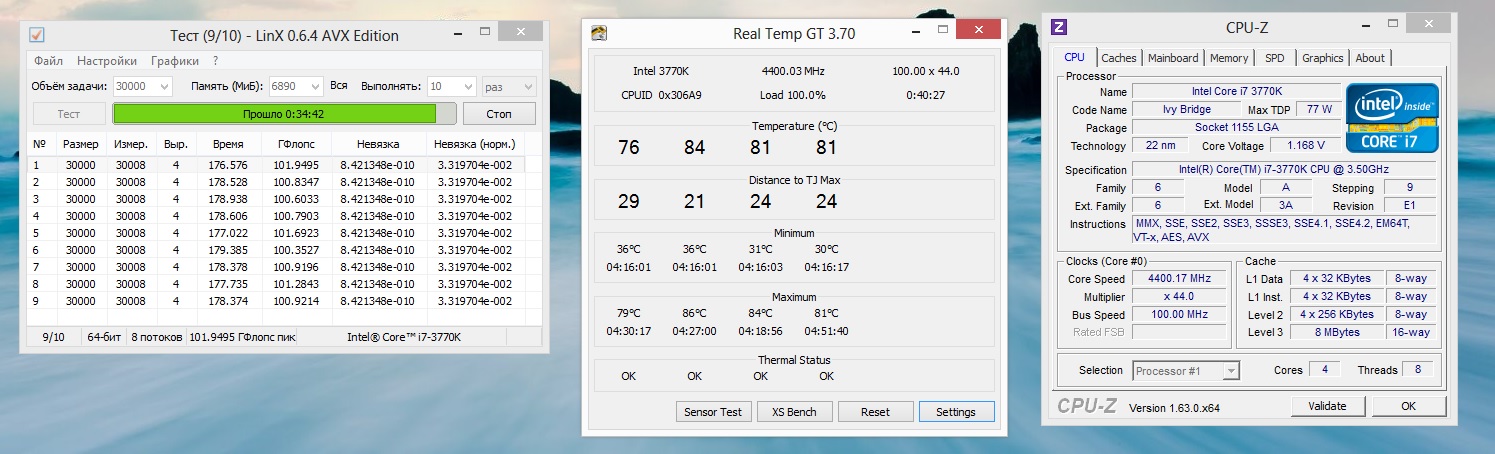 Dm-itry LinX + CPU-Z + RealTemp Win7x64 SP1. Версия программы по ссылке с AVX выдаёт 98гфлопс, но на скрине выше у человека частота лишь на 200мгц выше, а по тестам в обычной версии выдаёт больше, чем у меня в AVX linx.