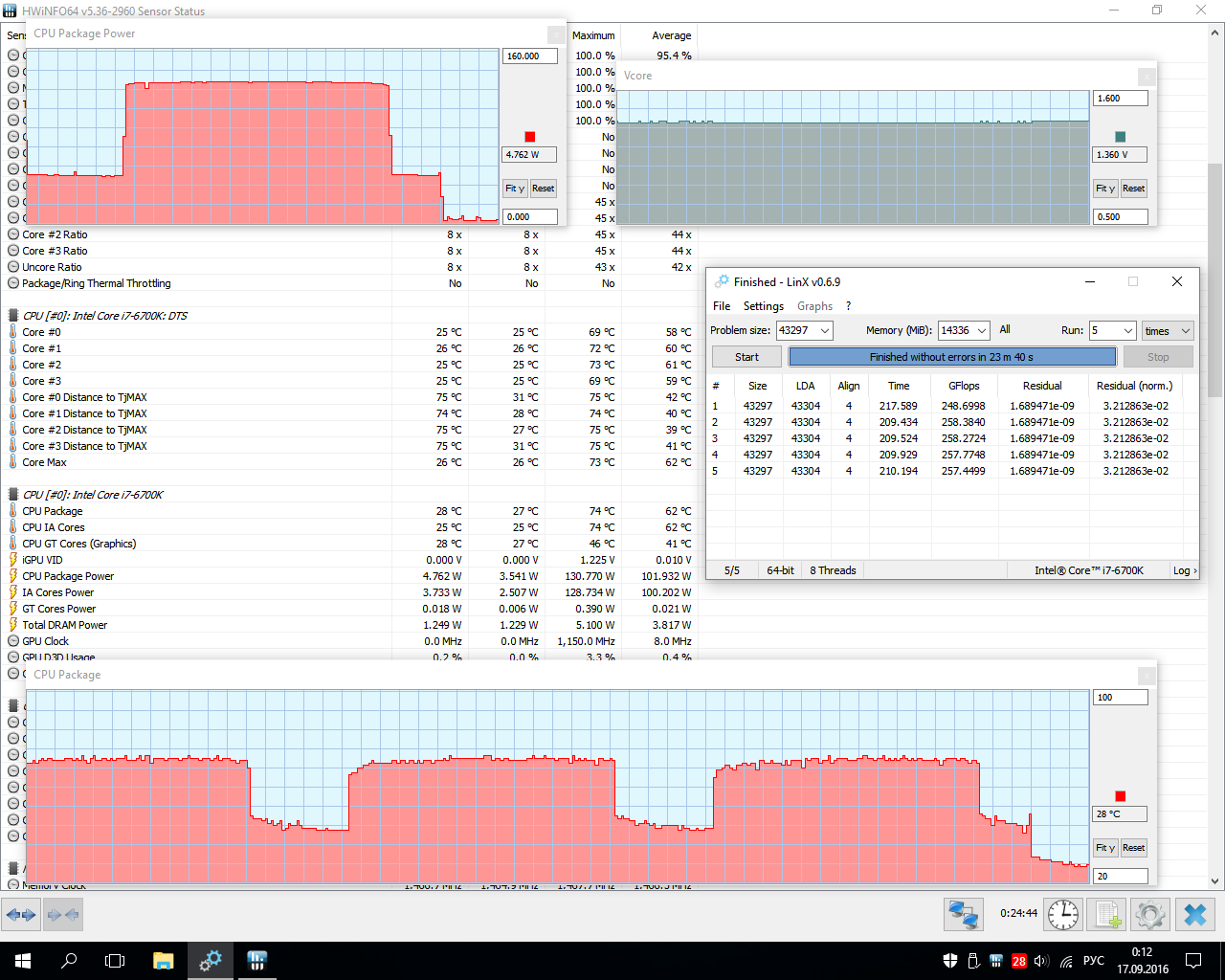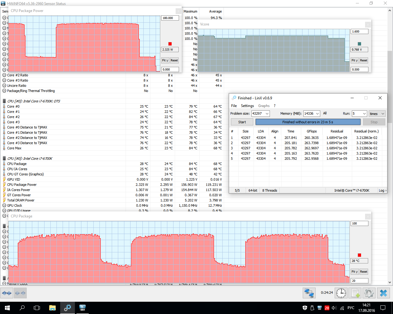 Magicm3n, да, точно, может, память нестабильность выдаёт? Она у меня всё время разогнана до 2933, 1.353 В, 16-16-16-36-2, vccio 1.05, vccsa 1.1. Вот только что потыкал адаптив и пришёл к таким интересным настройкам: ставлю LLC на самый высокий 7-й уровень, частоту 4600, макс. кеш 4400, напряжение 1.36, оффсет не трогаю. Получаю в простое (800 МГц) 0.768 В, на штатных 4000 1.184 В, в обычной нагрузке 1.392-1.408, в линпаке 1.44 (был единичный всплеск до 1.456). Похолодало, поэтому удалось удержать градусы ниже 85. А вообще, какие температуры при разгоне в LinX норма, а то боюсь "посадить" проц такой прожаркой? До 80, до 85, до 90?