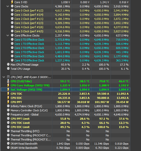При этом методе игнорируется лимит EDC, лимит TDC настраивается исходя из возможностей VRM, какой ток в амперах материнская плата может максимально выдать не перегревая VRM, лимит PPT это максимальное потребление процессора, особенно актуально если система охлаждения очень инертная. 5900X/5950X упрутся в температурный лимит в 90°С на самом горячем CCD, 5600X/5800X в 95°С, эти значения можно уменьшить при помощи настройки Platform Thermal Throttle Limit. Последние 5°С до этого лимита дают приличные пенальти к бусту.