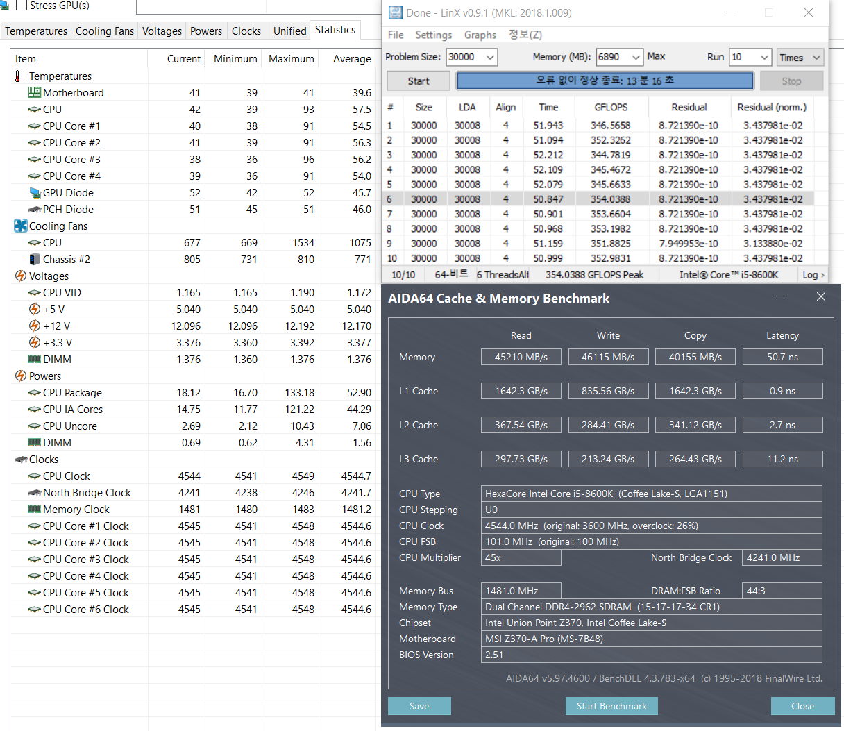 Полученный результат должен иметь следующий вид: Скриншот рабочего стола после прохождения >9 циклов (т.е. между 9 и 10 проходами). Вместе с LinX на рабочем столе должны быть развернуты CPU-Z (первая вкладка) и Core Temp, это обязательный минимум. Такой набор программ даст информацию о напряжении и температурах под нагрузкой-простоем. По желанию можете добавить другие программы, показывающие дополнительную информацию о вашей системе, например третью вкладку CPU-Z, которая покажет модель материнской платы и версию BIOS. Пример результата разгона: Mad Max, 5100 МГц (AVX 0), i7-8086K, HT-ON, Cache 4700, Vcore=1.36V, Batch L805E123, Gigabyte Z370 Aorus Gaming 7 (bios F6), Be Quiet! Dark Rock Pro 4, ЖМ под HS, Windows 10 Pro 64-bit 1809, LinX 0.9.3 64bit.