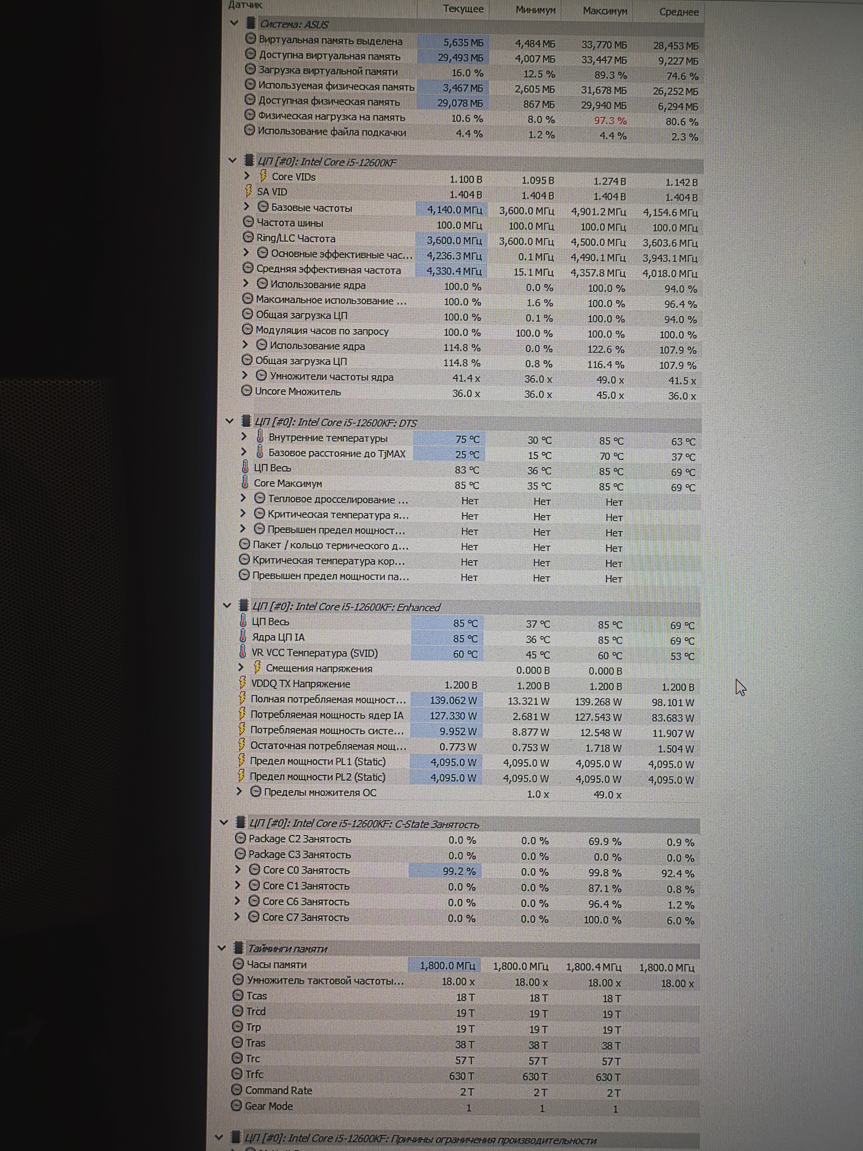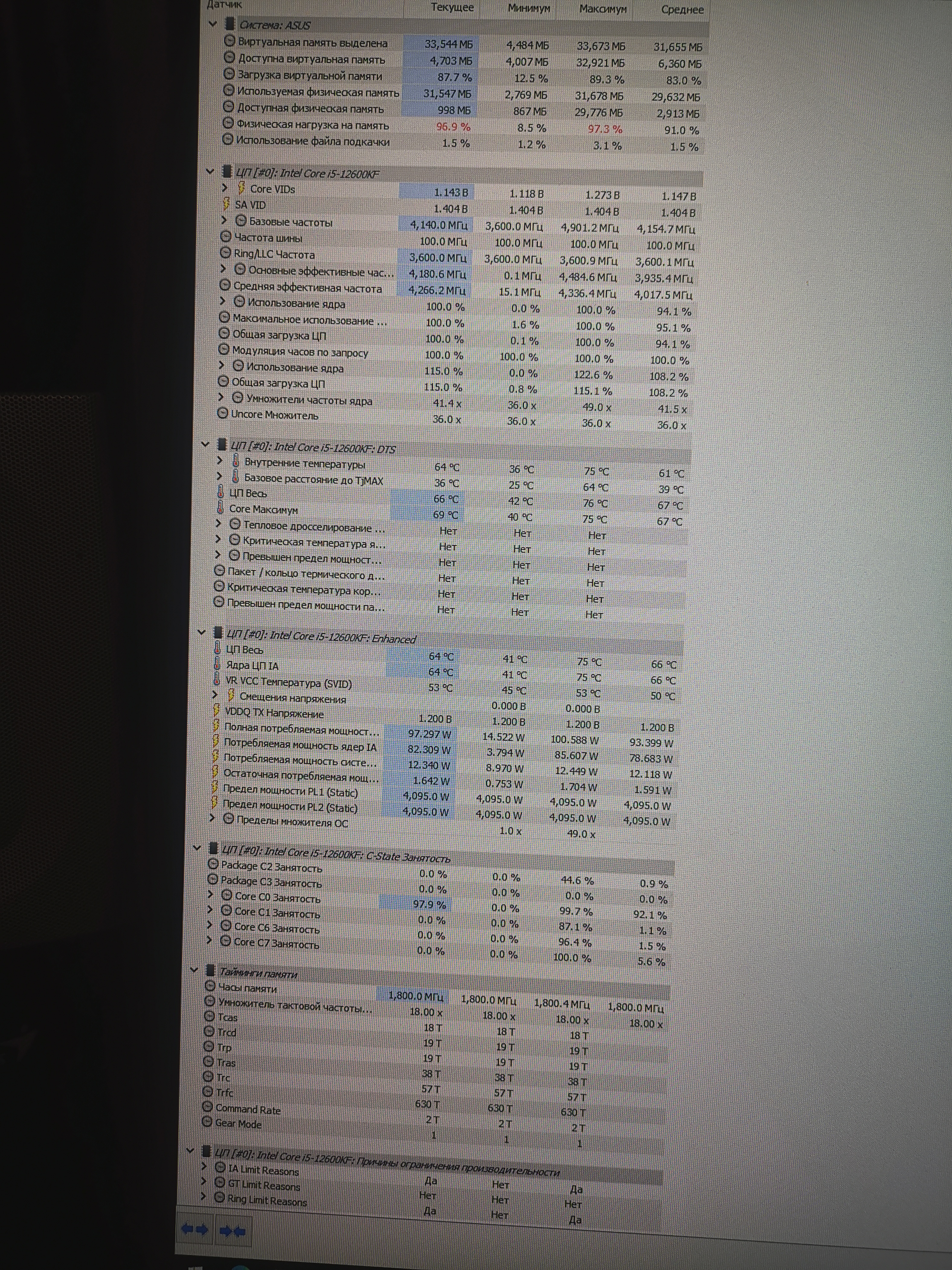Постараюсь кратко: Вобщем в играх без частых загрузок, со временем падает фпс (20-30 мин все хорошо) я это вижу по оверлею и чувствую в отзывчивости игр, но падение не критичное (пока что) с 120 до 80 и держится потом 2,3 часа в 80Фпс, с дропами до 73 (где то каждые 10минут). Проц по ядрам загружен не более чем на 60%.Ssd вроде тоже в порядке. Видюха не греется 65С в играх. А вот память у меня Hwinfo не показывает температуры, только дуал и разгон 3400Гц.
