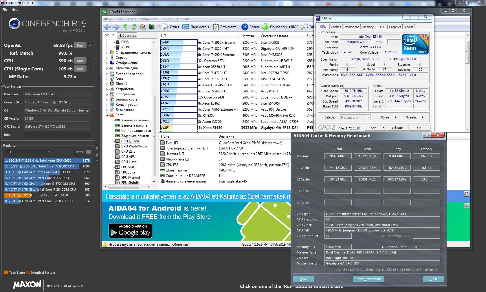 Отпишусь и я, по быстрому удалось достать только E5430, ждать с али совсем не хотелось:) Мать Gigabyte GA-EP45-DS4, до этого крутился Q8200 2.3@3.5 fsb 500mhz Vcore 1.55. Ради интереса захотелось Xeon, нашел на авито позвонил барыга находился в 1 остановке от меня:) обошлось в 2500р, купил прилетел домой, надрезал сокет запихал, собрал, надо сказать сокет вообще легко подрезался, куллер у меня Thermaltake big typhoon v, снять гораздо проще чем одеть:) В общем припарился завёл комп, проц сразу опознался без бубна, загрузилась ось без нареканий и каково было моё удивление, проц завёлся на 4000mhz 500*8, v-core 1.55, биос то никто не скинул:) Но радость была не долго тесты проходят иногда падает диспетчер окон виндовс, скайп вообще не стартует, стабилно оказалось на 490mhz 3920mhz, вечер игр система пережила. Сделал несколько тестов.