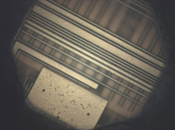 Имхо толщина слоя с логикой не составит и 1% процента от общей толщины кристалла (судя по фото из статьи, на которую я ранее давал ссылку), но лучше не испытывать судьбу Интересно, почему есть ограничения на кол-во металлических слоев (если можно так выразится)? Не более 6~8? Восьмиугольное "окно" на фото - оторванный микро-BGA контакт кристалла, через которое видно микроструктуру чипа Ссылка на статью, кто не видел: http://habrahabr.ru/post/127205/