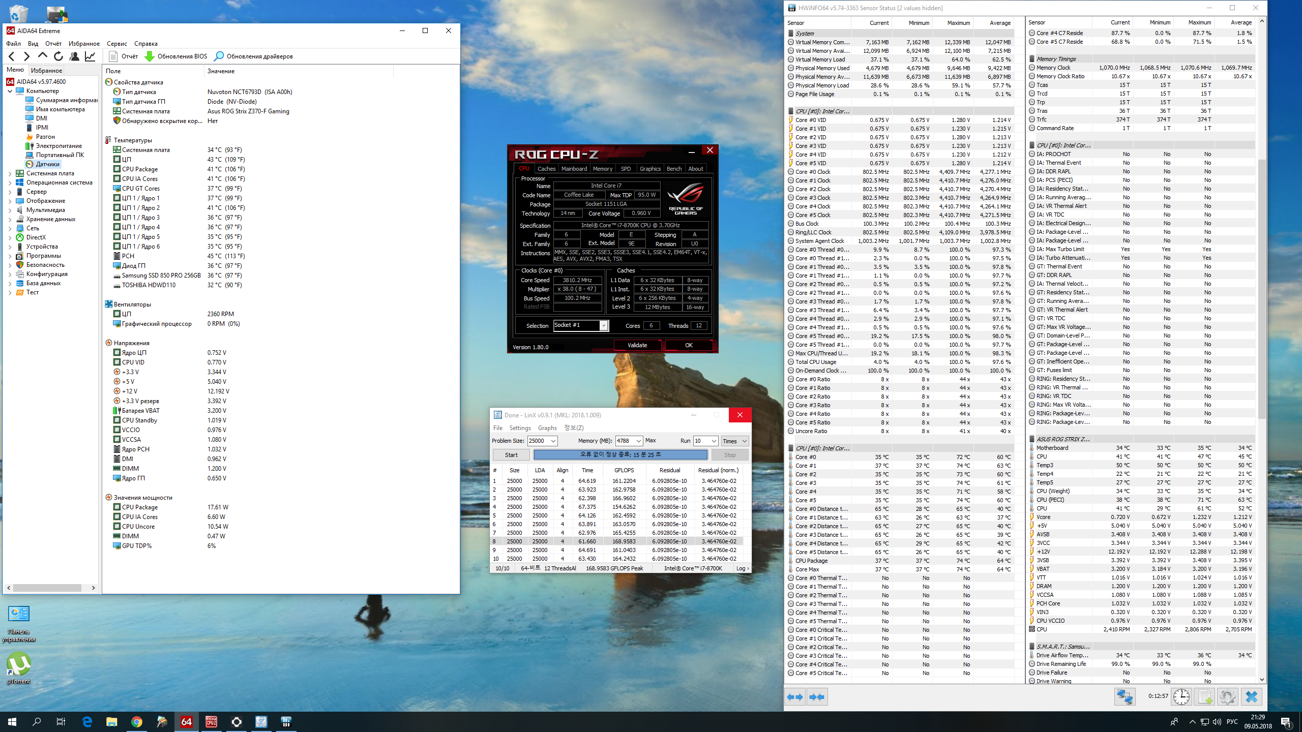 Полученный результат должен иметь следующий вид: Скриншот рабочего стола после прохождения >9 циклов (т.е. между 9 и 10 проходами). Вместе с LinX на рабочем столе должны быть развернуты CPU-Z (первая вкладка) и Core Temp, это обязательный минимум. Такой набор программ даст информацию о напряжении и температурах под нагрузкой-простоем. По желанию можете добавить другие программы, показывающие дополнительную информацию о вашей системе, например третью вкладку CPU-Z, которая покажет модель материнской платы и версию BIOS. Пример результата разгона: Mad Max, 5100 МГц (AVX 0), i7-8086K, HT-ON, Cache 4700, Vcore=1.36V, Batch L805E123, Gigabyte Z370 Aorus Gaming 7 (bios F6), Be Quiet! Dark Rock Pro 4, ЖМ под HS, Windows 10 Pro 64-bit 1809, LinX 0.9.3 64bit.