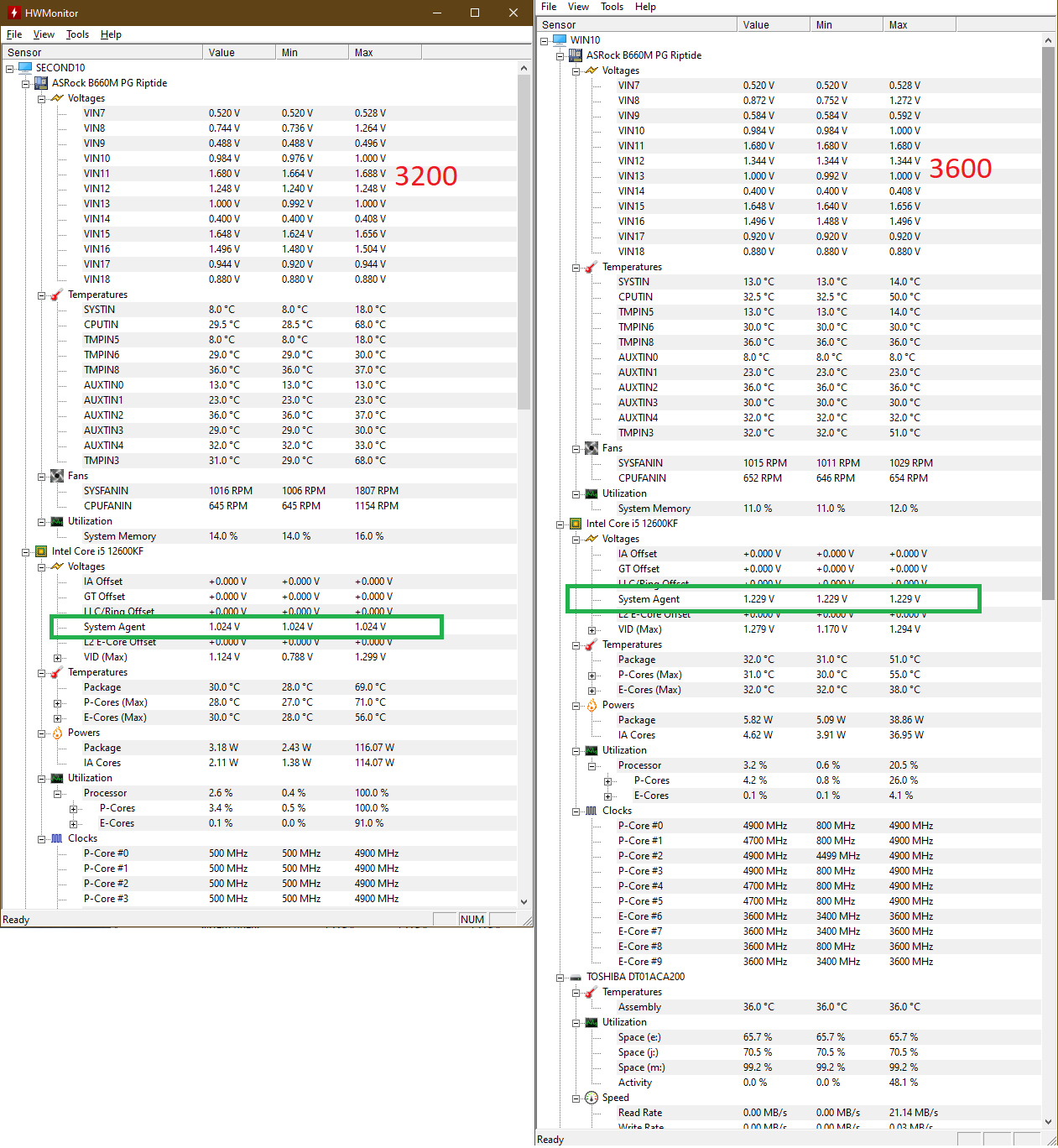 Приехал 12600KF, проверил на asrck b660 riptide, разгон по шине доступен, но экземпляр, к сожалению, такой же неудачный, как и на основном ПК для 5ГГц по P-core требует напряжение 1.25В (или выше), i5-12400 5ГГц берет на 1.2В, разница в нагреве почти +7-10С (это с отключенными E-core). Так же на B660 плате доступен разгон памяти с повышением VCCSA, но на Riptide оно выставляется автоматически, в AMIAPTIO искал эту настройку, но так и не нашел. В smokeless_umaf настройка VCCSA есть, но настройки не сохраняются.