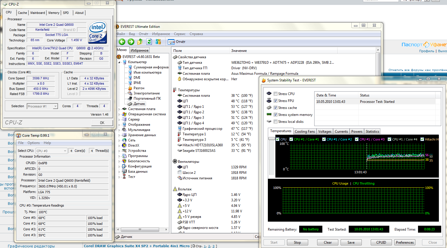 Сегодня решил повторить 450*8 и был приятно удивлен (похоже сказалась оптимизация охлаждения в корпусе): #77#77 LinX пока не запускал, т.к. он где-то на другом компе валяется, а искать как-то влом))). В простое t*ядер~35*С. СО не сильно шумная, стоят тихие вентиляторы, больше всего шумит БП и один из хардов.