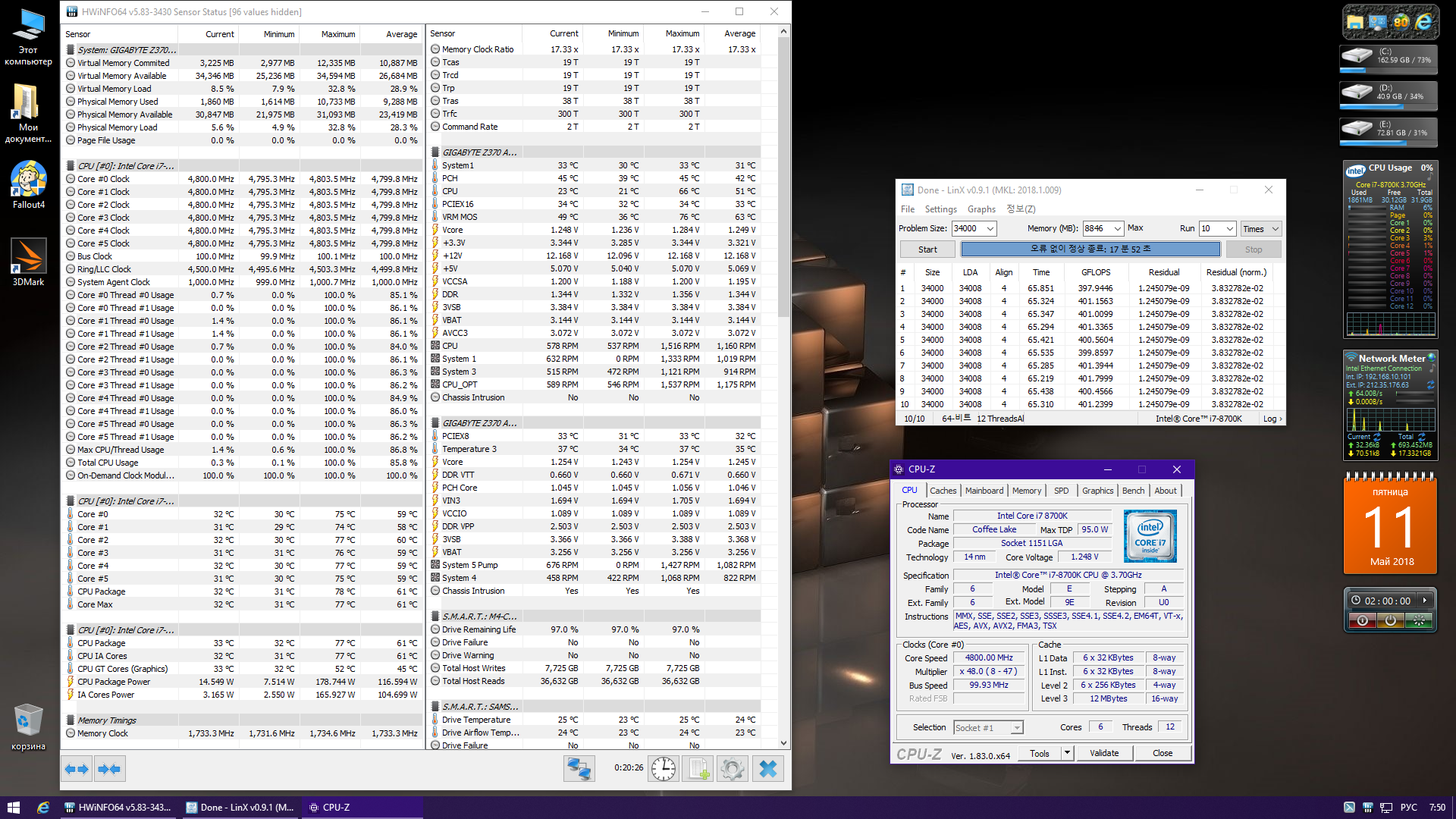 Полученный результат должен иметь следующий вид: Скриншот рабочего стола после прохождения >9 циклов (т.е. между 9 и 10 проходами). Вместе с LinX на рабочем столе должны быть развернуты CPU-Z (первая вкладка) и Core Temp, это обязательный минимум. Такой набор программ даст информацию о напряжении и температурах под нагрузкой-простоем. По желанию можете добавить другие программы, показывающие дополнительную информацию о вашей системе, например третью вкладку CPU-Z, которая покажет модель материнской платы и версию BIOS. Пример результата разгона: Mad Max, 5100 МГц (AVX 0), i7-8086K, HT-ON, Cache 4700, Vcore=1.36V, Batch L805E123, Gigabyte Z370 Aorus Gaming 7 (bios F6), Be Quiet! Dark Rock Pro 4, ЖМ под HS, Windows 10 Pro 64-bit 1809, LinX 0.9.3 64bit.