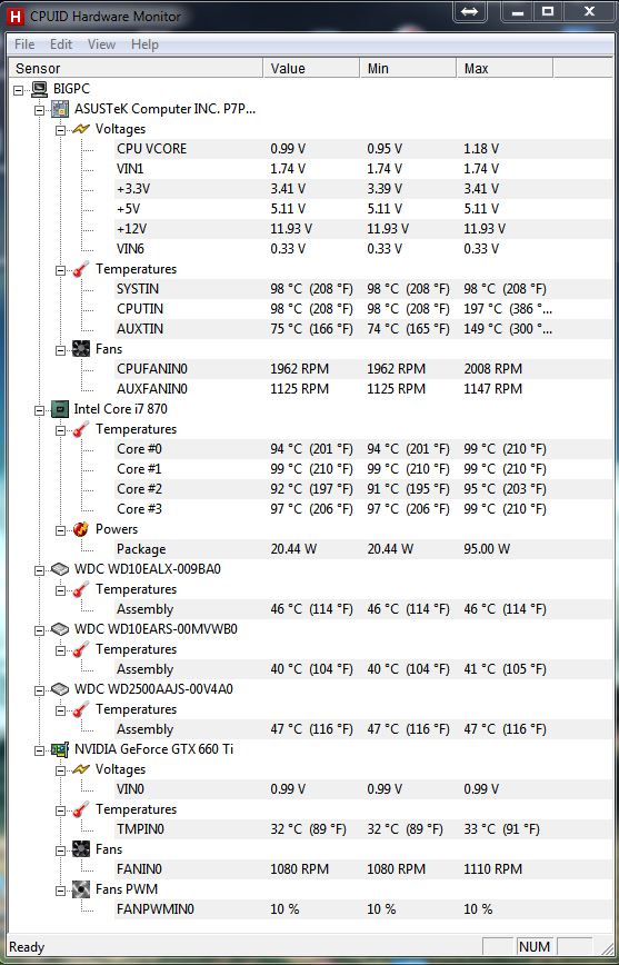 сейчас температура 98 показывает, крышка у компа открыта и отрыто окно.. мне чет стремно.. а и кстати не смог поменять в биосе вольтаж он там заблокирован..