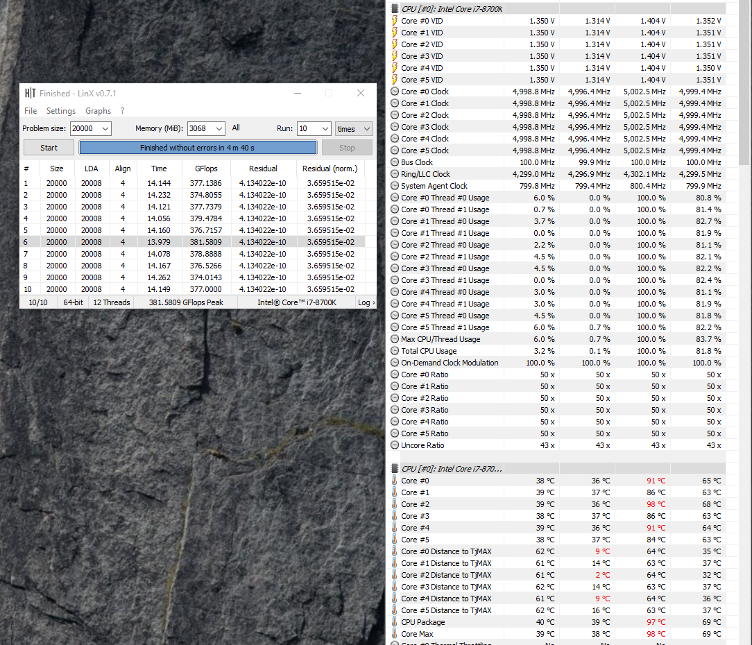 Полученный результат должен иметь следующий вид: Скриншот рабочего стола после прохождения >9 циклов (т.е. между 9 и 10 проходами). Вместе с LinX на рабочем столе должны быть развернуты CPU-Z (первая вкладка) и Core Temp, это обязательный минимум. Такой набор программ даст информацию о напряжении и температурах под нагрузкой-простоем. По желанию можете добавить другие программы, показывающие дополнительную информацию о вашей системе, например третью вкладку CPU-Z, которая покажет модель материнской платы и версию BIOS. Пример результата разгона: Mad Max, 5100 МГц (AVX 0), i7-8086K, HT-ON, Cache 4700, Vcore=1.36V, Batch L805E123, Gigabyte Z370 Aorus Gaming 7 (bios F6), Be Quiet! Dark Rock Pro 4, ЖМ под HS, Windows 10 Pro 64-bit 1809, LinX 0.9.3 64bit.