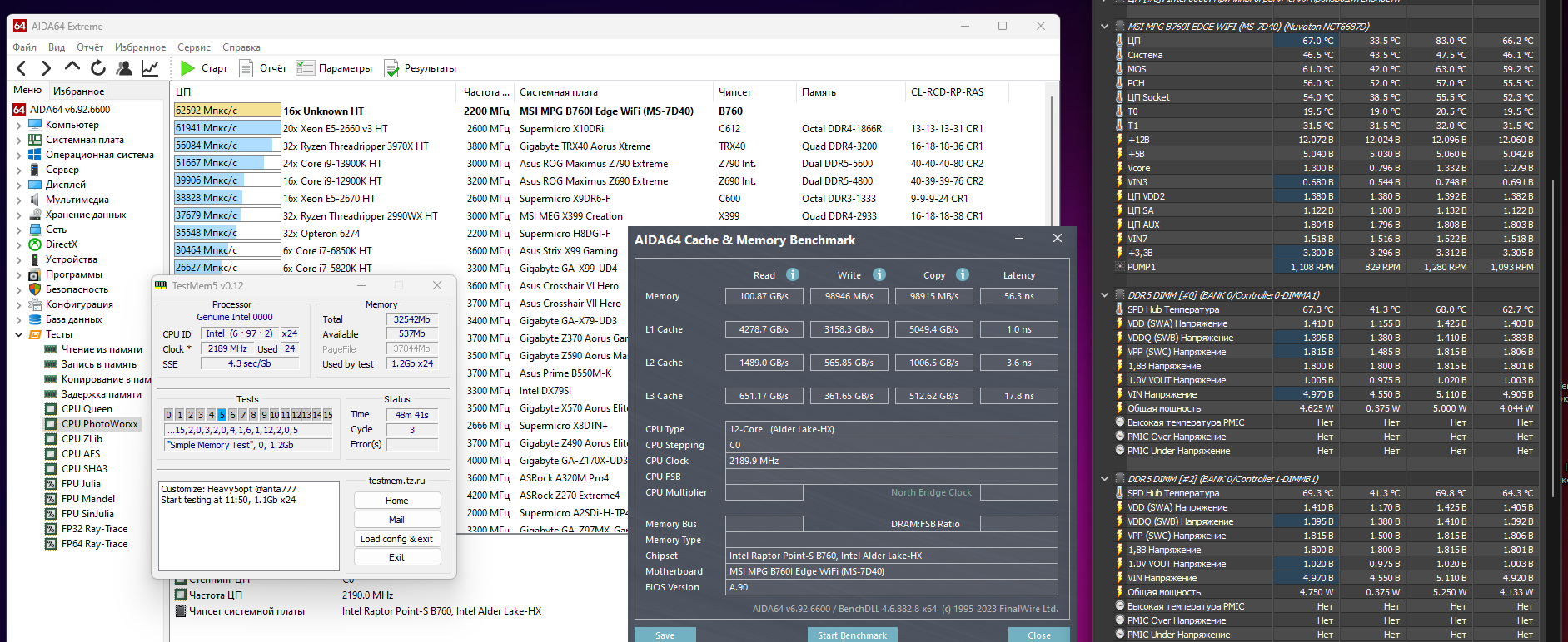 Пока 5.0 по Р и 3.8 по Е, +0.12V оффсетом через xtu на llc mode8. Можно потом будет потестить-погнать всякие ТБ опции типа 5.2 на 2-4 потока/5.1 на 4-6 и т.д. как время будет. Троттлит очень в бенчах по темпам. В играх 60-80 градусов. Крышка толстая, толще оригинальной, но короче нее, выпирает над прижимной рамкой примерно на 1мм. По некоторым данным, под ней фазовый переход. Крышка очень криво посажена на клейкий герметик, но можно скальпировать. Память в 4 dimm матерях не едет выше 4800 с очень большими таймингами, уже многие потестили, я тоже на 4 dimm b760. В 2 dimm материнке память поехала 6400 32-38-38-58 с ужимом первичек, вторичек и третичек ~100 Гб/с по чтению, записи и копировании, аида мерит около 55-56нс. Поведение нестандартное - не полюбила высокий вольтаж на плашках, максимум 1.41V, активный обдув не помог. Встройка работает, дрова встают. У одного обзорщика Vcore неправильно показывала, у меня SA. У меня еще охлад такой себе под него, тоже учитывать надо.
