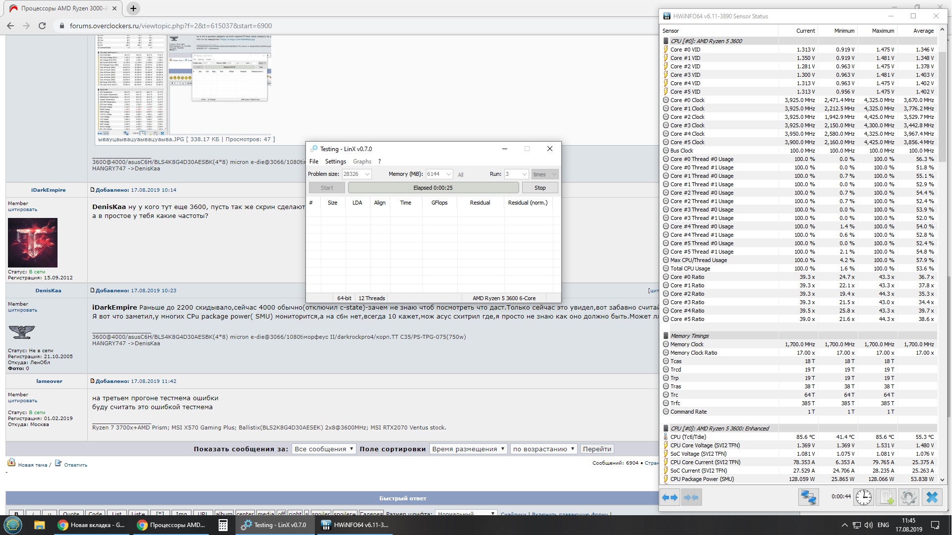 включил мониторинг, немного поиграл, посмотрел ютюб, посидел в браузере, увидел 4500 МГц хз откуда столько кстати, максимальный буст на ядро, помеченное звездочкой в RM... на остальные ядра 4400, 4375, 4475, 4425 и 4400. А вообще сейчас дела поделаю и буду тестить 1600 в разгоне против 3600 в типа стоке с одинаковой памятью-материнкой и системой