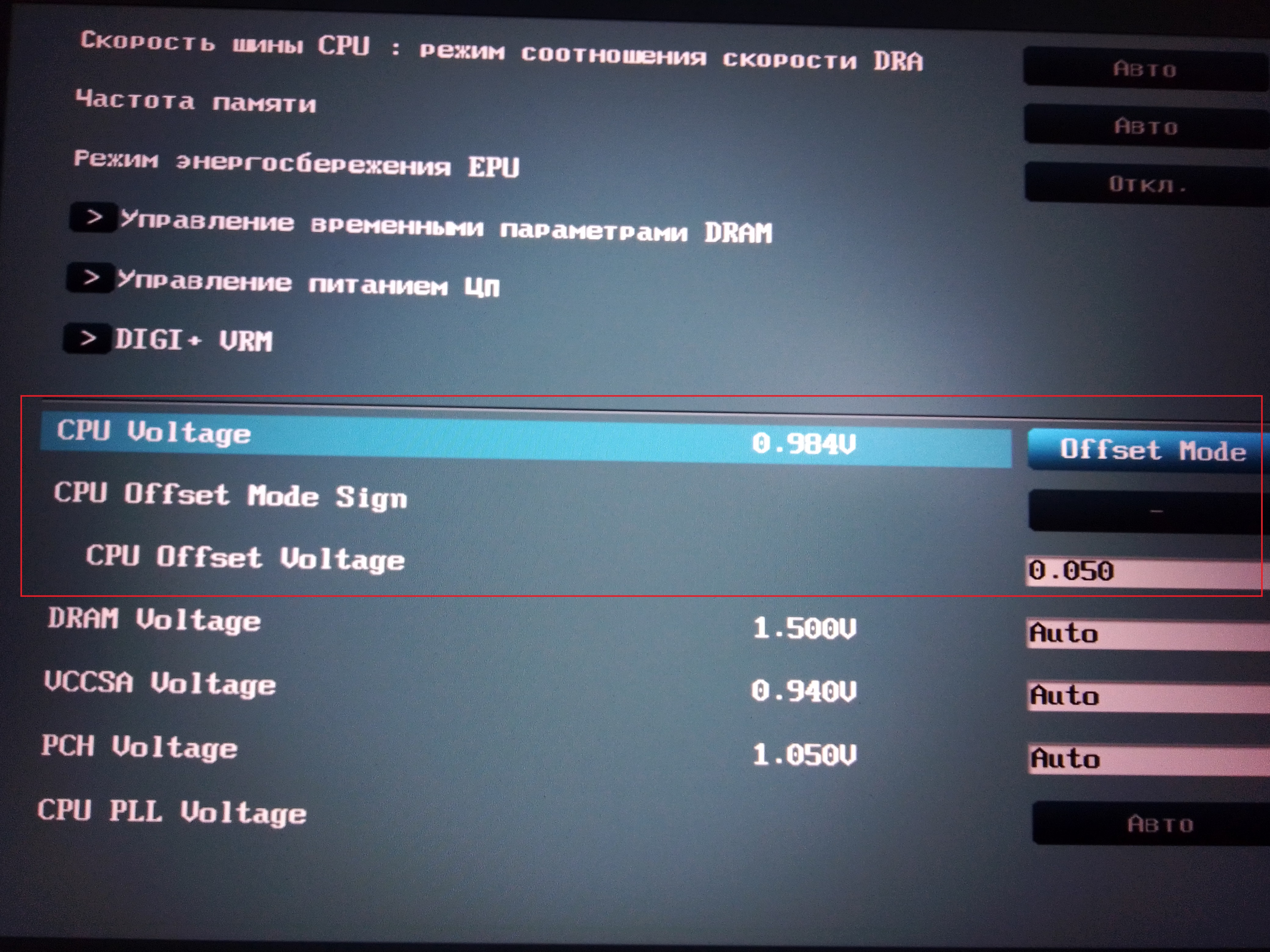 PS. Схема следующая, смотрим вольтаж в стоке под нагрузкой, далее выставляем шину на 103 (всё в авто) - смотрим в нагрузке насколько завысила материнка напряжение и начинаем офсетом с минимальным шагом занижать напряжение, стремясь к стоковому.