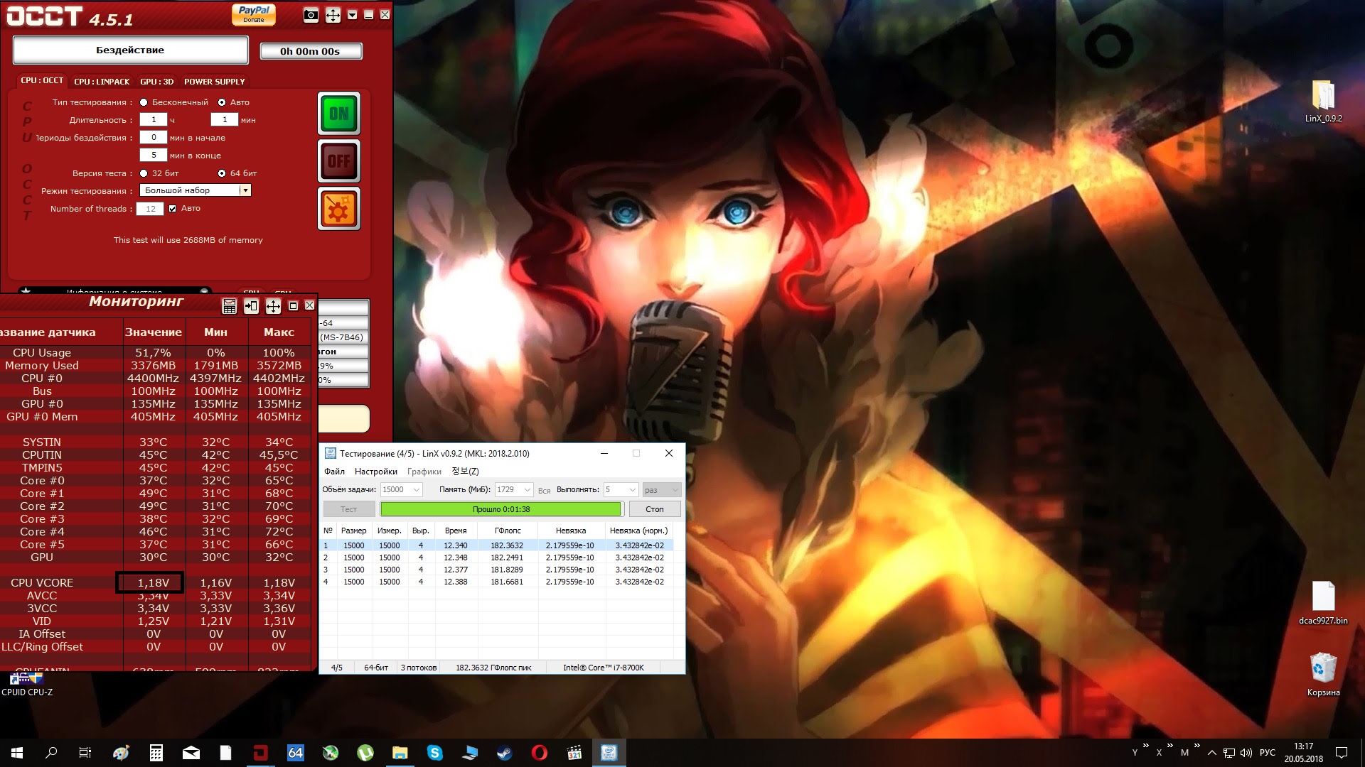 Полученный результат должен иметь следующий вид: Скриншот рабочего стола после прохождения >9 циклов (т.е. между 9 и 10 проходами). Вместе с LinX на рабочем столе должны быть развернуты CPU-Z (первая вкладка) и Core Temp, это обязательный минимум. Такой набор программ даст информацию о напряжении и температурах под нагрузкой-простоем. По желанию можете добавить другие программы, показывающие дополнительную информацию о вашей системе, например третью вкладку CPU-Z, которая покажет модель материнской платы и версию BIOS. Пример результата разгона: Mad Max, 5100 МГц (AVX 0), i7-8086K, HT-ON, Cache 4700, Vcore=1.36V, Batch L805E123, Gigabyte Z370 Aorus Gaming 7 (bios F6), Be Quiet! Dark Rock Pro 4, ЖМ под HS, Windows 10 Pro 64-bit 1809, LinX 0.9.3 64bit.