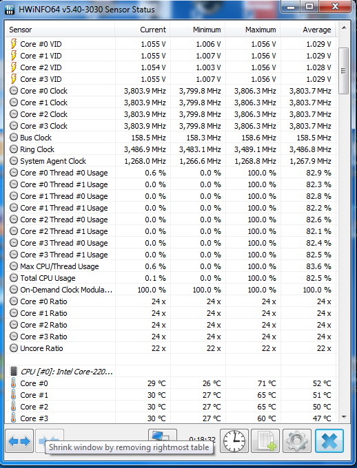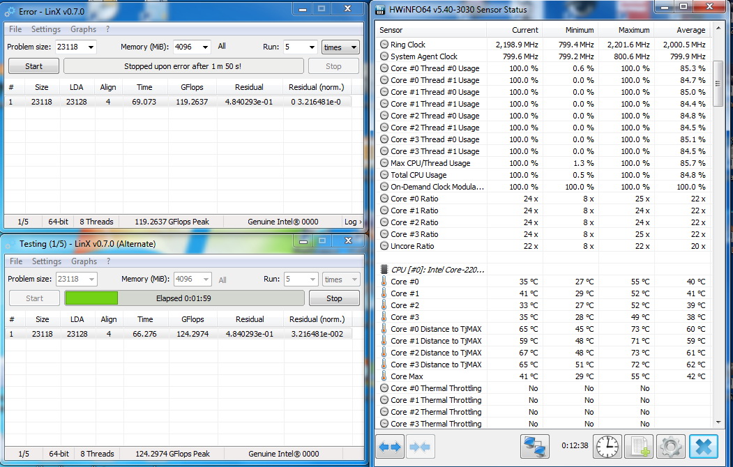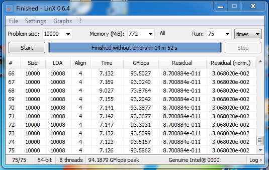 Для успешного прохождения стресс теста LinX 0.7.0 пришлось поднять напряжение vcore до 1.17в, хотя LinX 0.6.4 проходил при 1.15в. В любом случае, 1.17в при 3800Мгц - это хорошо. Вопрос: почему температура 1-го ядра настолько вырывается вперед: 77 градусов против 71,68 и 65? Дело в особенности архитектуры процессора или некачественном термокомпаунде?