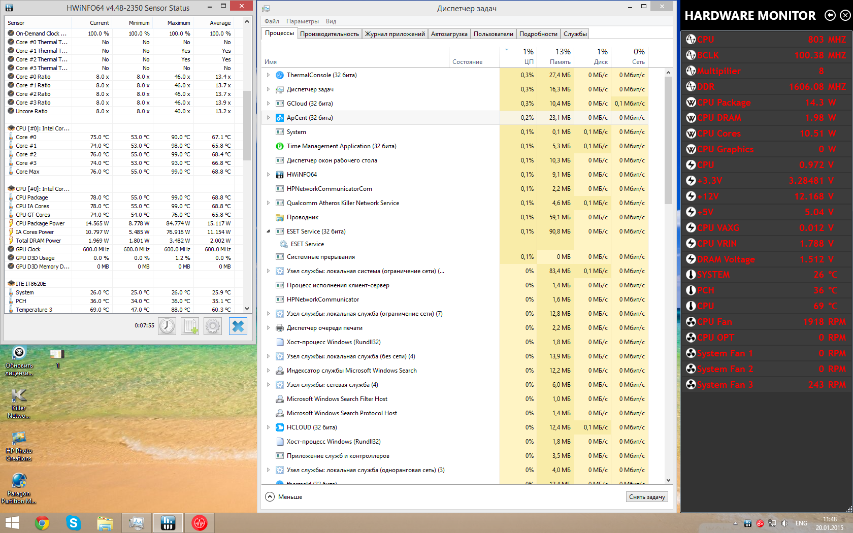 При запуске системы куллер начинает гнать около 2000 rpm (мощно и шумно), запускается система. При входе в систему запускаю HWiNFO64 v4.48-2350. Температура процессора на уровне 60 °C, затем начинает постепенно расти и доходит до 100 °C. При запуске диспетчера задач показывает загрузку оперативной памяти до 70%, а порой и 99 %, при этом нагрузка на центральный процессор 5-10 %.