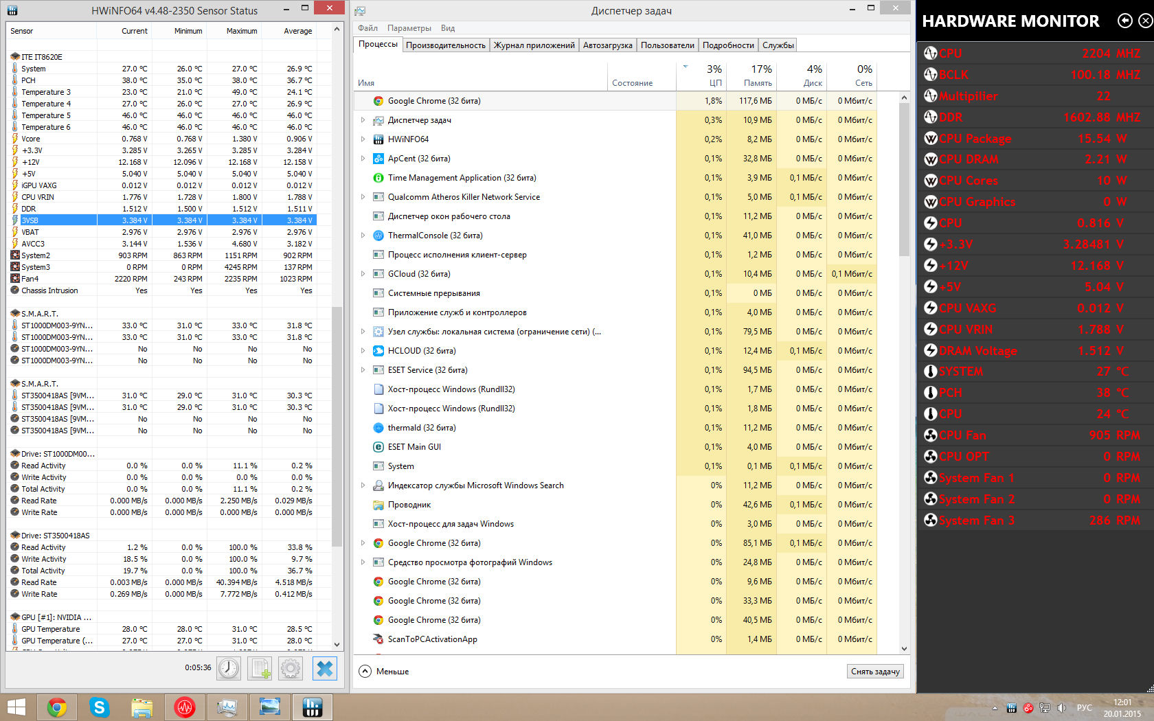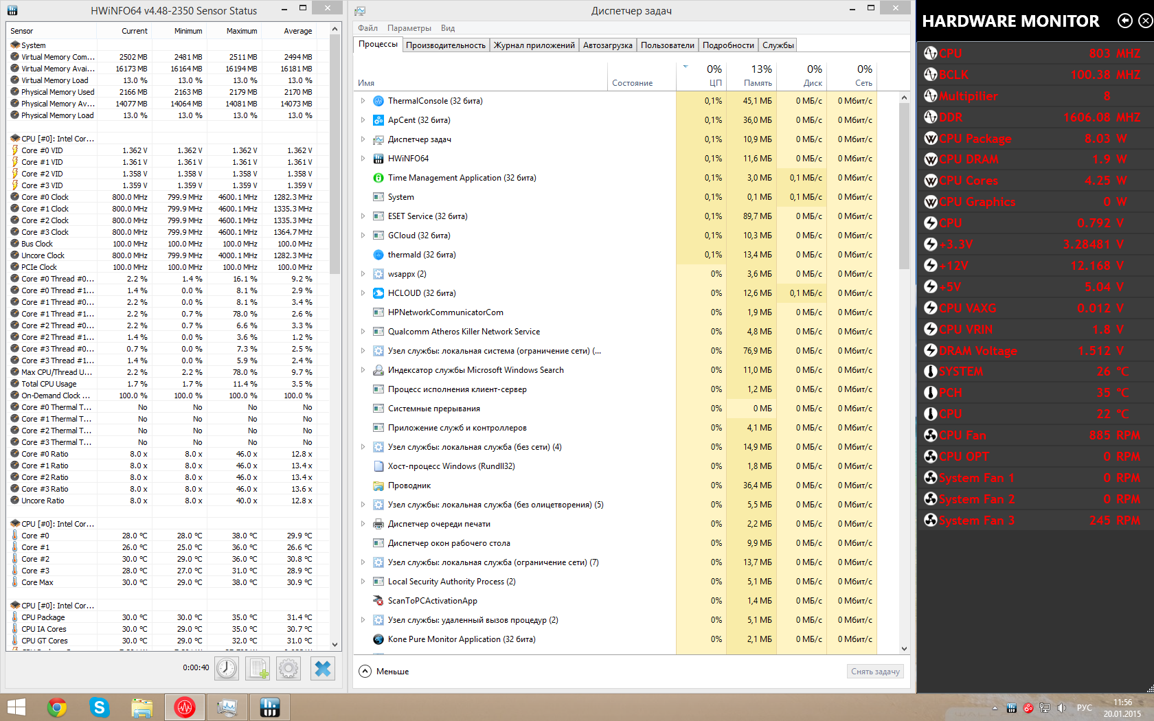 Материнская плата: GIGABYTE Z97X-Gaming 3 Процессор: Intel Core i7-4790K 4000.0 Mhz Оперативная память: 16Gb DDR-III 1600MHz Kingston HyperX Fury Black (HX316C10FBK2/16) (2x8Gb KIT) Жесткий диск : Видеокарта: Palit GTX 650 2gb 128bit Охлаждение процессора:DeepCool Maelstrom 120 Блок питания: FSP Group AURUM CM 750W Операционная система: Windows 8.1