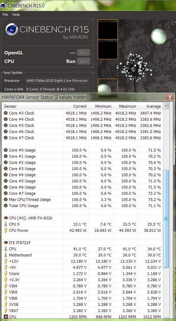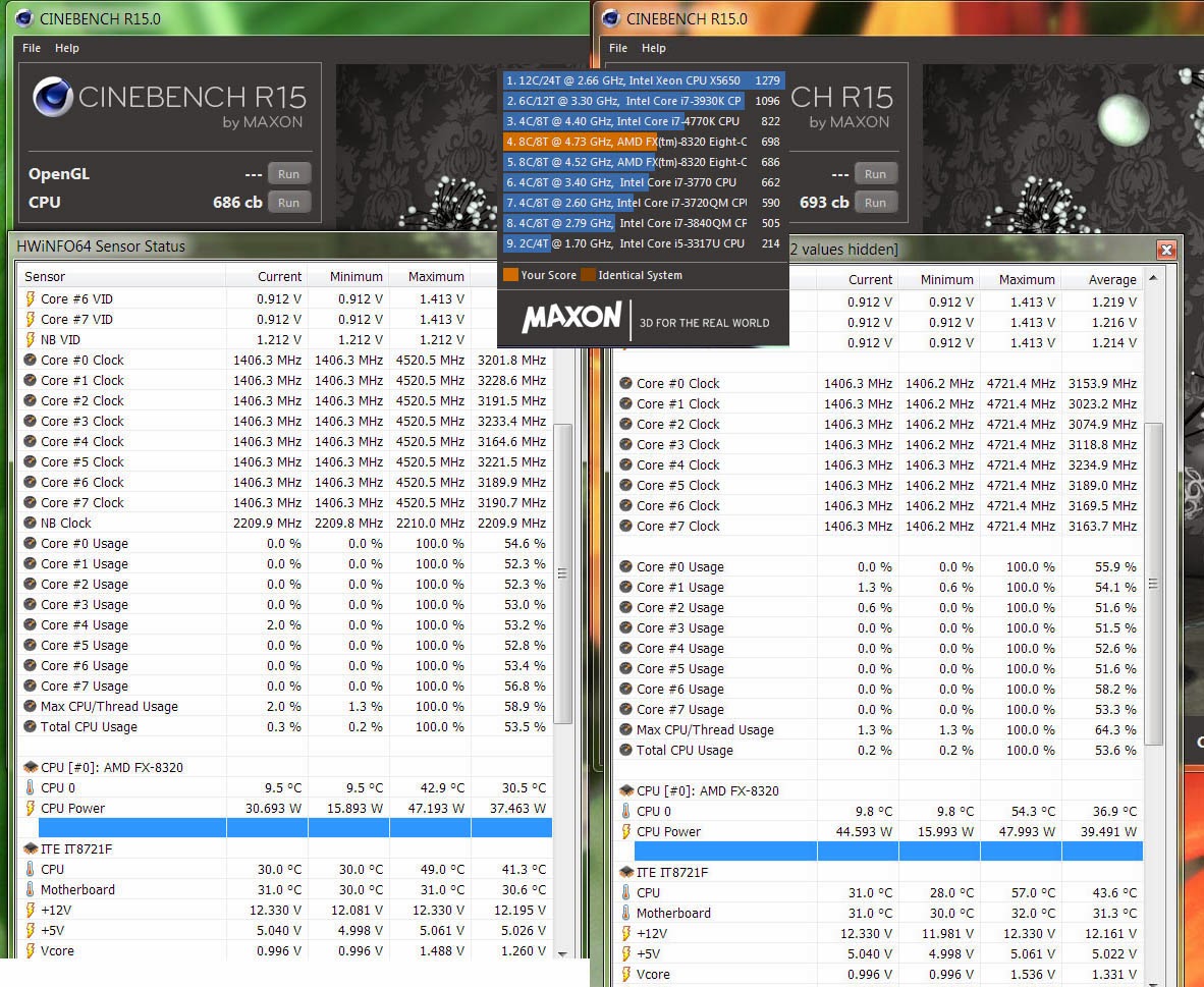benchmarks CPU@over Сore VID Vcore Tamb Tmb Tcore Tcpu AVERAGE CPU cooling Fan CPU CinebenchR15 8320 @4721 8 1.413 1.536 22,00 32,00 54,00 57,00 55,50 Zalman10performa 1x120mm