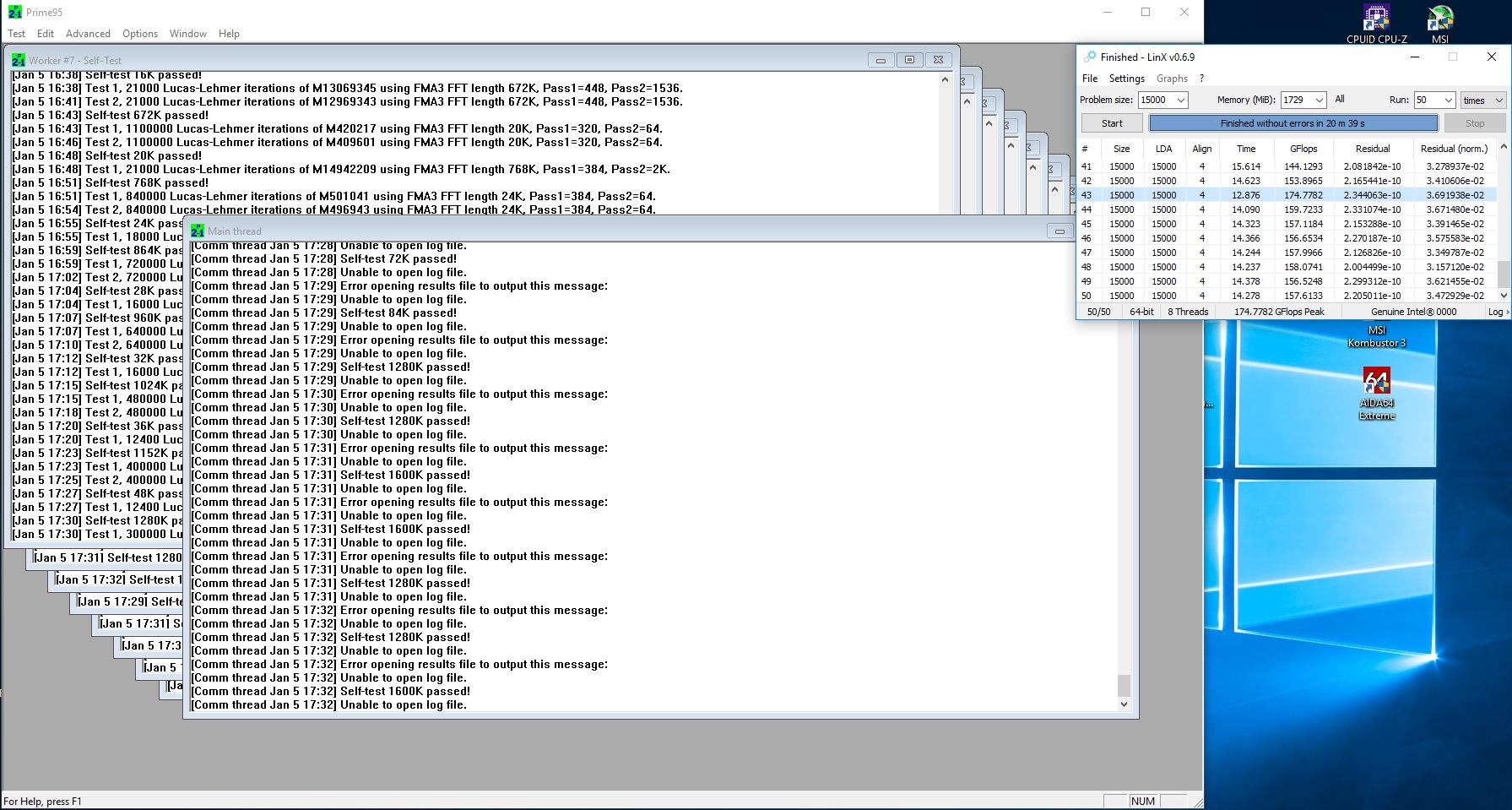 Решил на праздниках поточнее подобрать напряжение процессора на 4Ггц. До этого 4 Ггц работали на 1,35, но я по сути и не использовал этот разгон, т.к. на тот момент не поборол "файлед оверклокерс" при перезагрузках и включении ПК. Сразу скажу мне в лом тестить через каждый шаг два, по этому грубо говоря я менял напряжение с шагом в 0,025. В общем дошел до того, что на 1,25 крашится в линксе. На 1,275 работает нормально, но для уверенности оставил 1,3 что бы уж наверняка Так вот вопрос. Прогонял 3 часа прайма - ок, линкс 50 прогонов, задача 15000 - ок. А потом решил прогнать прайм бленд + линкс. Ошибок не было, но результат в линксе таков - см. картинку. Я так понимаю что разность результатов линкса при данном тестировании (совместно с праймом) это нормально? ЗЫ: на ошибку прайма не смотрите, распаковал в програмные файлы, а там винда ему лог не дает создать
