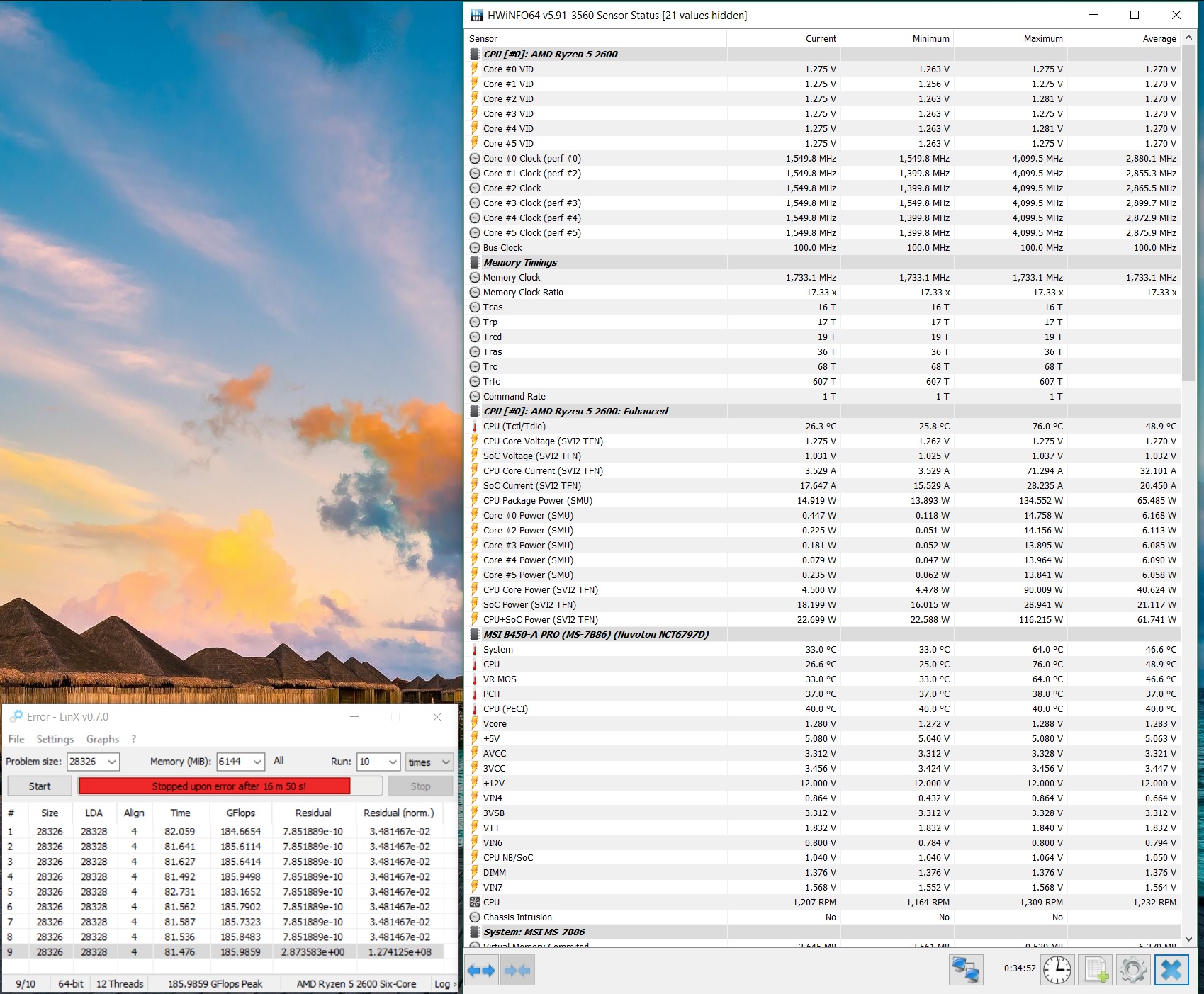 Щас стыкую процессор и ОЗУ. 4.1 на процессор и 3466 ОЗУ. CPU Core Voltage 1.2750, SoC 1.03125, CLDO VDDP 0.850, Global C-State auto, C'n'C auto, LLC3. Отдельно все стабильно, линки, ТМ, прайм гоняется без ошибок. Но встыке в Linx вылезла ошибка.
