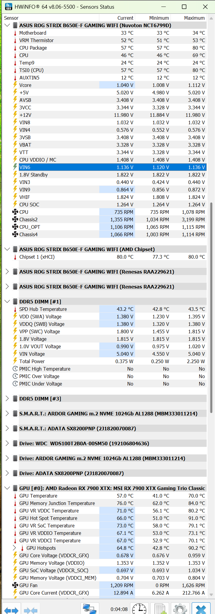 Память видно 44->57 град и т.д., а чипсет 82-95град