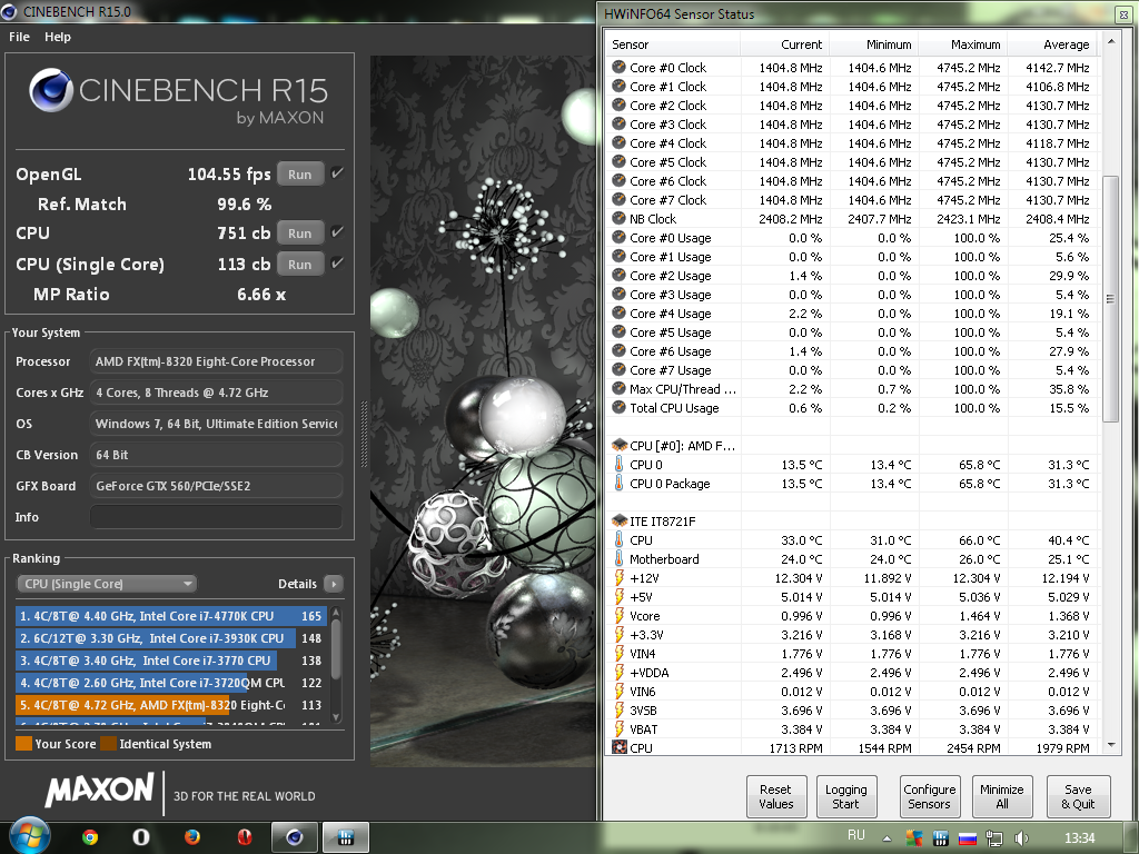Чуть чуть поднял напряжение, результаты получше, правда и температура тоже, хотя крышку боковую закрыл, сам системник стоит в нише стола, по идее обдув только спереди - и все это в полуметре от батареи, так что температура нормальная. Все стабильно вроде, грелки гонять не буду, а вот тяжелые игры, бенчи и кодирование вроде держит: Вентиль правда шумит, это жуть, как будто на взлет