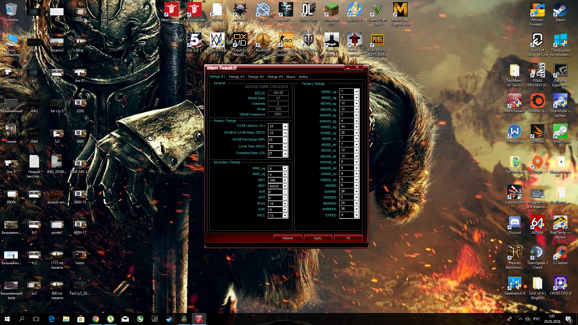 Полученный результат должен иметь следующий вид: Скриншот рабочего стола после прохождения >9 циклов (т.е. между 9 и 10 проходами). Вместе с LinX на рабочем столе должны быть развернуты CPU-Z (первая вкладка) и Core Temp, это обязательный минимум. Такой набор программ даст информацию о напряжении и температурах под нагрузкой-простоем. По желанию можете добавить другие программы, показывающие дополнительную информацию о вашей системе, например третью вкладку CPU-Z, которая покажет модель материнской платы и версию BIOS. Пример результата разгона: Mad Max, 5100 МГц (AVX 0), i7-8086K, HT-ON, Cache 4700, Vcore=1.36V, Batch L805E123, Gigabyte Z370 Aorus Gaming 7 (bios F6), Be Quiet! Dark Rock Pro 4, ЖМ под HS, Windows 10 Pro 64-bit 1809, LinX 0.9.3 64bit.