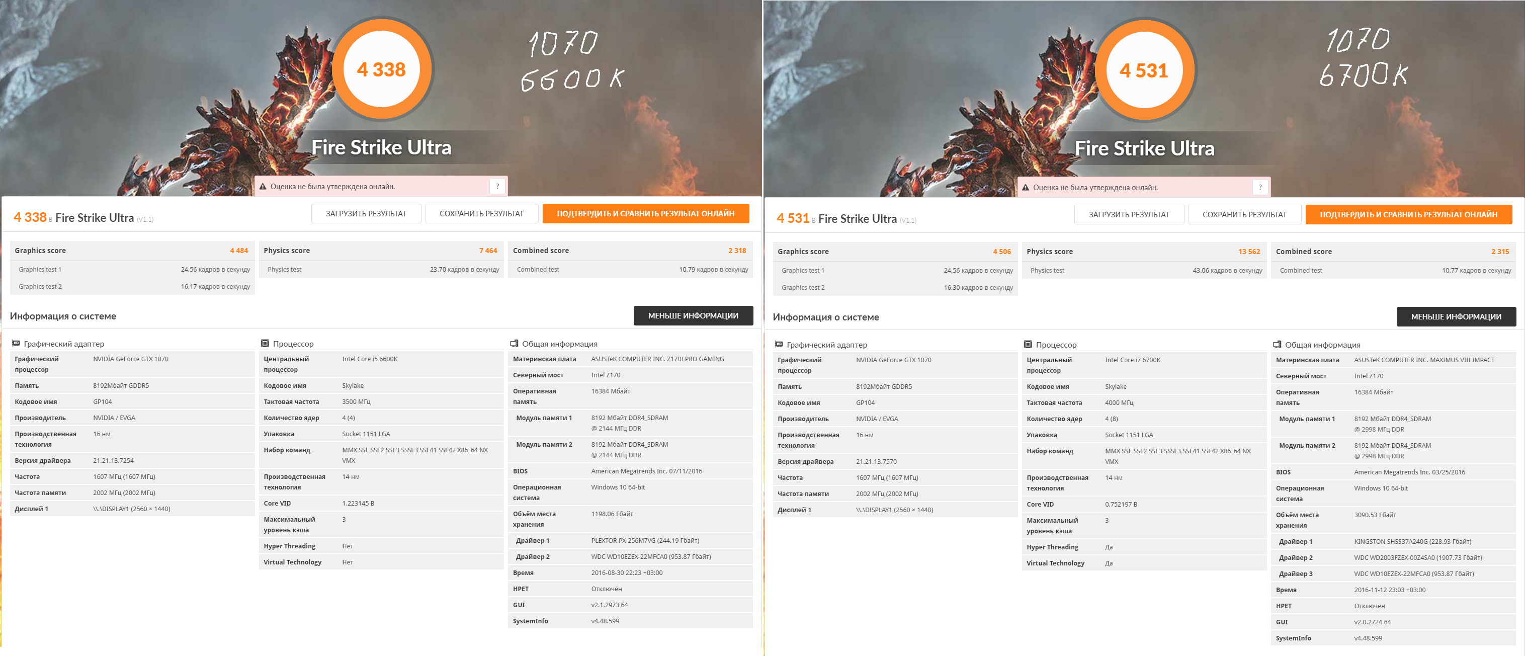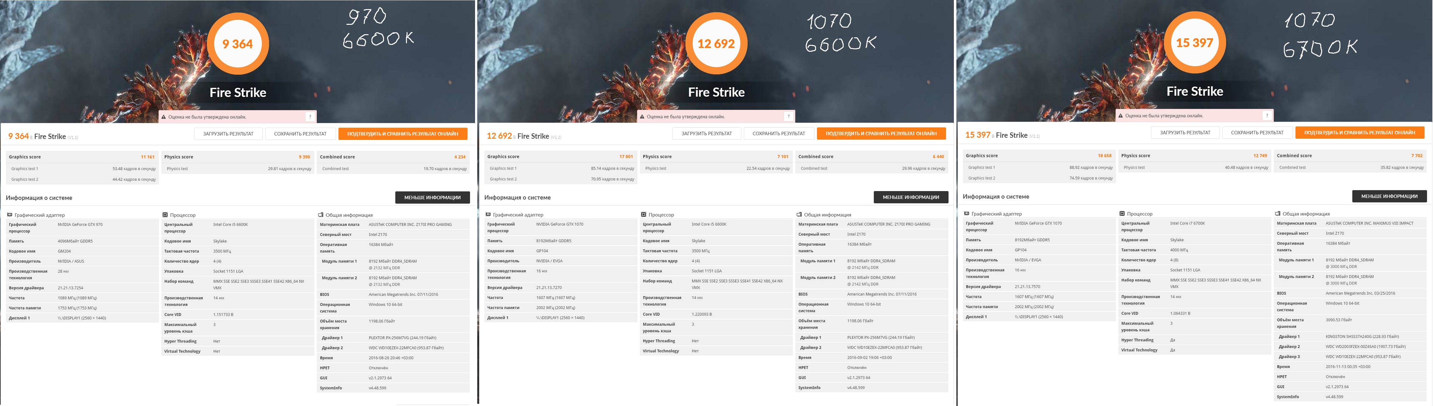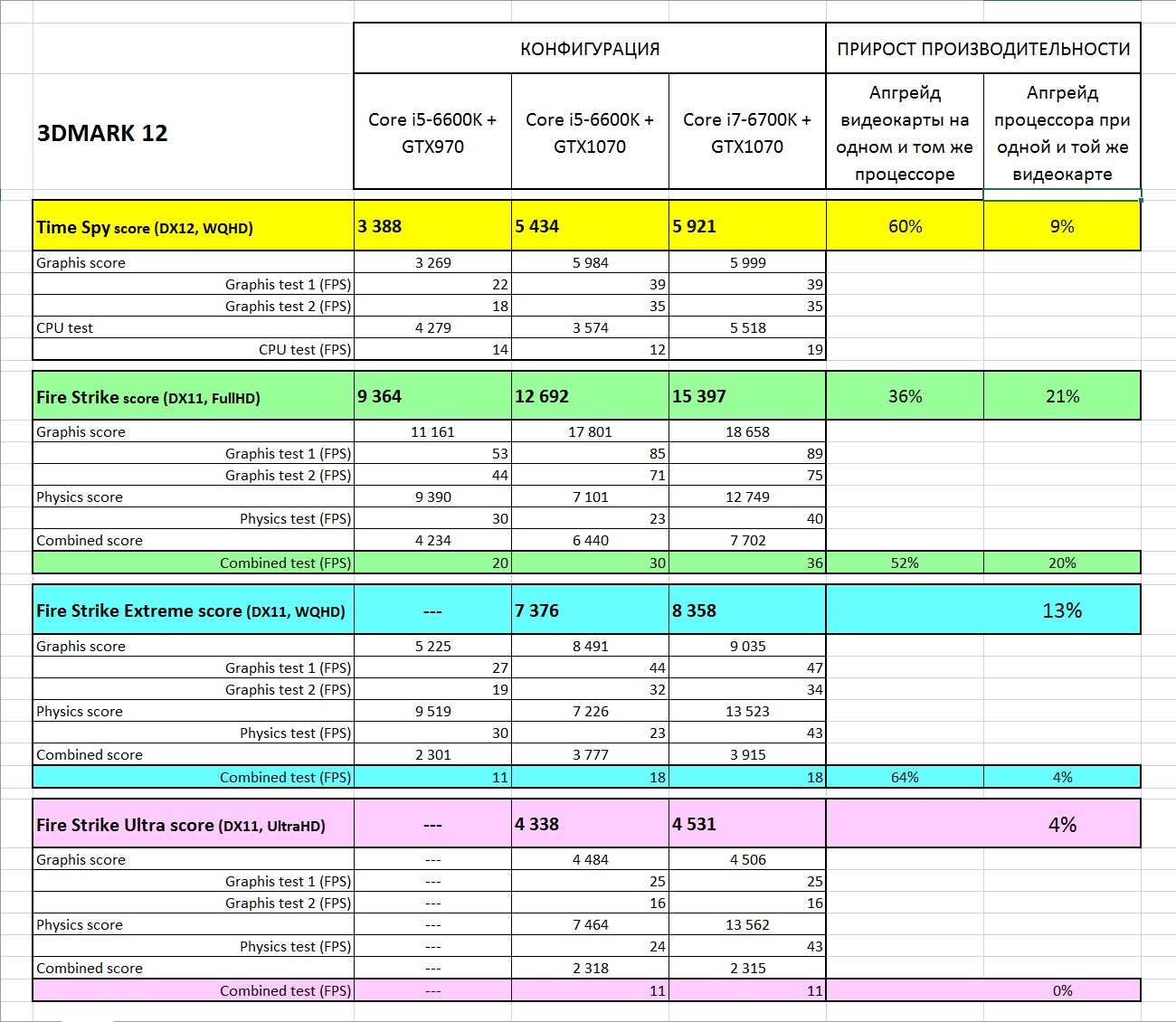 В общем и целом, картина результатов ожидаема. С каждым апгрейдом - рост производительности. И общие баллы тому подтверждение. Единственно не совсем понятно, почему в связке 1070+6600К показатели процессора хуже чем при 970+6600К. При том что общий результат все равно значительно выше. Когда все показатели свел в одну таблицу и подсчитал цифры, картина стала еще интереснее. Я рассматривал FPS для Combined test в каждом тесте как наиболее приближенный к реалиям ну и еще общий балл для наглядности.