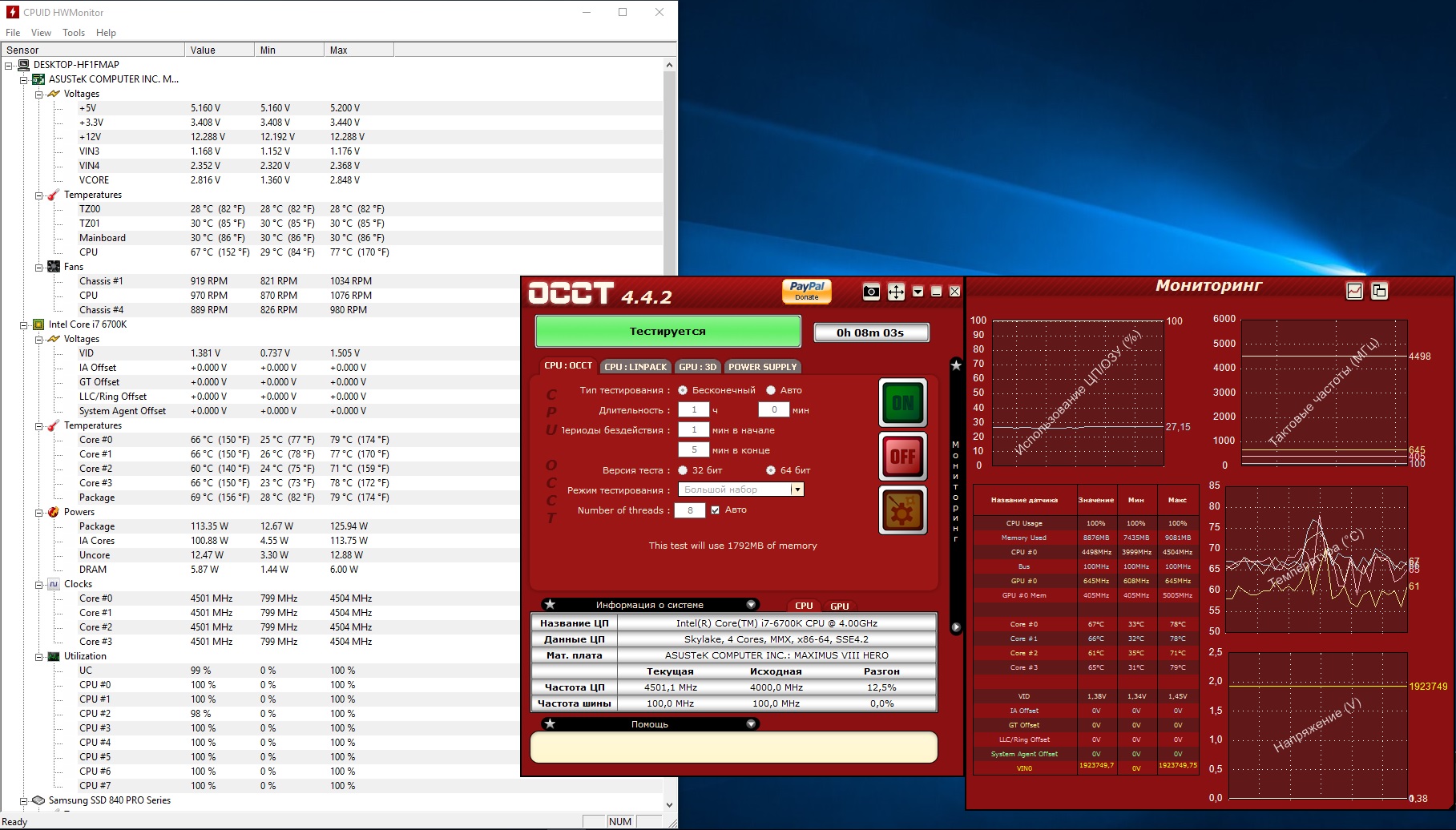 Вот прошел тесты. Система в профиле. В биосе поставил Сpu core manual mode и Cpu core voltage 1.35. Множитель 45. Что скажите? Почему прыгает напруга? вроде же поставил Сpu core manual mode?