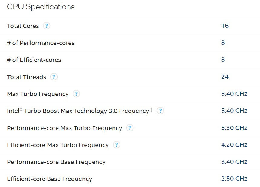 ♻️ Processor Cores (P+E) В новых процессорах сохраняется гибридная архитектура ядер. P - ядра, Perfomance - производительность, т.е. высокопроизводительные (Raptor Cove) и E - ядра, Efficiency - эффективность, т.е. энергоэффективные (Gracemont) Высокопроизводительные ядра в свою очередь имеют технологию Hyper Threading (в скобках указано количество потоков) Процессоры серии i9 имеют 8 P-ядер и 16 E-ядер (8P+16E), т.е. производительных и эффективных соответственно. В общей сложности 24 ядра (32) Процессоры серии i7 (семейство i7-14700) имеют 8 Р-ядер и 12 Е-ядер (8Р+12Е). В общей сложности 20 ядер (28) Процессоры серии i7 (семейство i7-13700) имеют 8 P-ядер и 8 E-ядер (8P+8E). В общей сложности 16 ядер (24) Процессоры серии i5 (i5-14600K(KF)/13600K(KF)/14600/14500/13600/13500) имеют 6 P-ядер и 8 E-ядер (6P+8E). В общей сложности 14 ядер (20) Процессоры серии i5 (только i5-14400(F)/13400(F)) имеют 6 Р-ядер и 4 Е-ядра (6Р+4Е). В общей сложности 10 ядер (16) => аналог i5-12600K, но с заблокированным множителем и сниженными частотами.