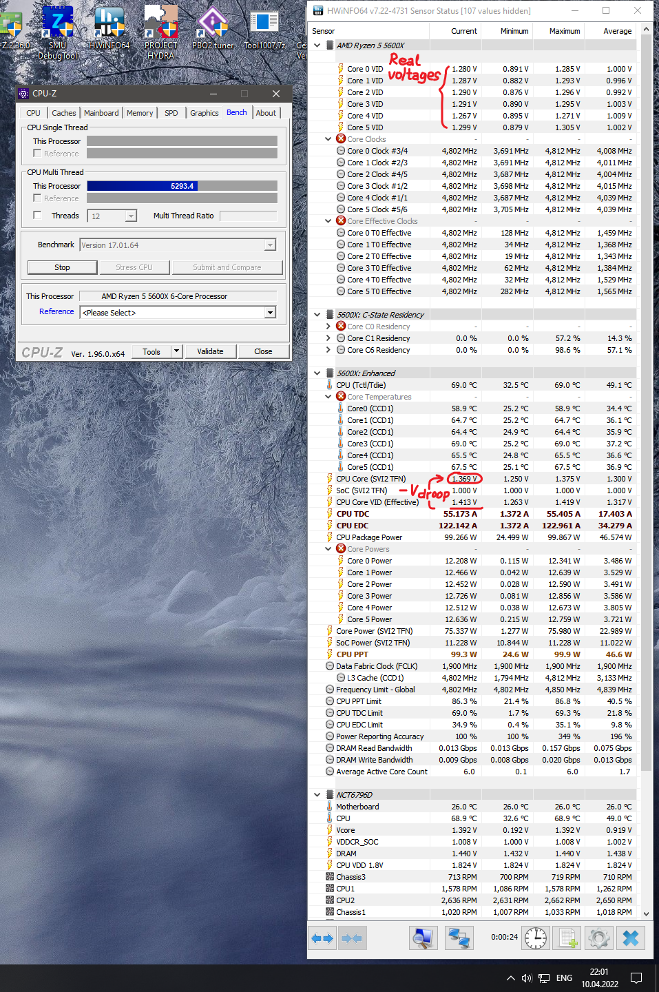 Согласен с Andy-s. Все в порядке на скринах. Реальное пиковое напряжение на VDD_CPU 1.288V в CPU-Z (напряжение на самих ядрах и L3 еще меньше) Core VID Effective - это лишь запрашиваемое напряжение у VRM (без Vdroop). Вот CPU-z и напряжения, правда с 5600Х, но сути это не меняет: