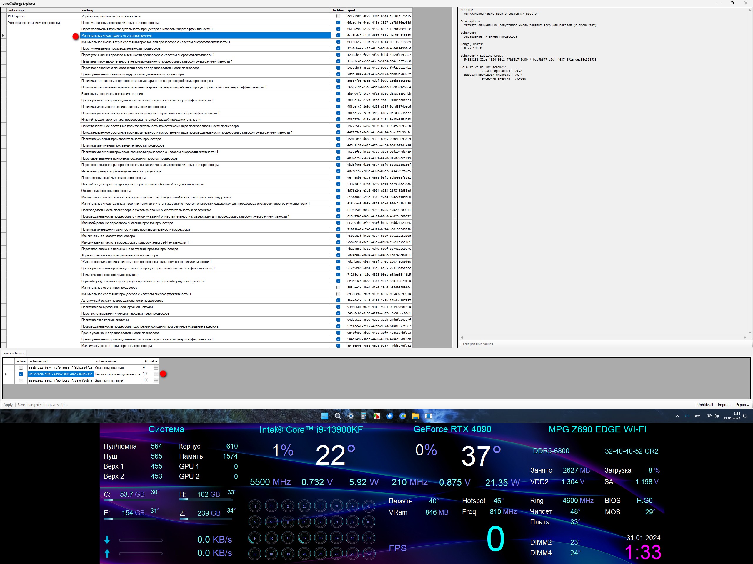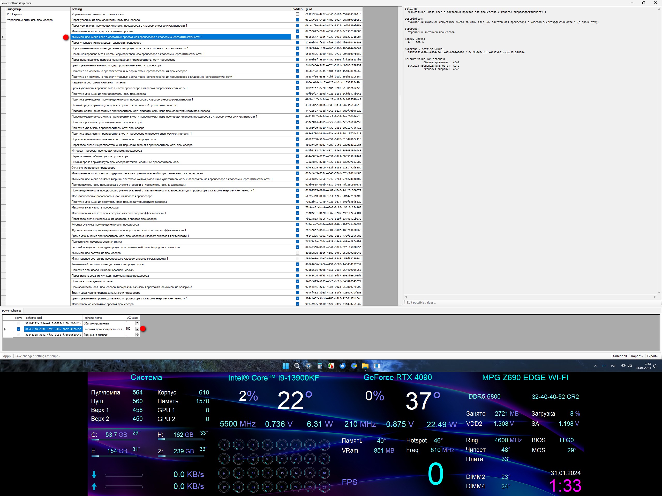 Меняем 4% на 100% в своём плане питания. Этим отключаем нафик кривую парковку ядер, которую мелкомягкие втихаря зачем-то включили, начиная с w11 22h2 15. По желанию можно поставить план высокой или максимальной производительности (с выкл парковкой). Частоты будут вверху, спидшифт будет переключать только напряжение относительно нагрузки. ТБ3.0 работает. 16. Сохраняем стабильный профиль. Сравниваем попугаев до и после. Особенно если нет возможности отключения IA CEP. Можно сравнивать в процессе. R20 либо cpu-z быстро всё покажут. 17. Если собрались гнать память, то сначала настраивайте её, потом уже проц.