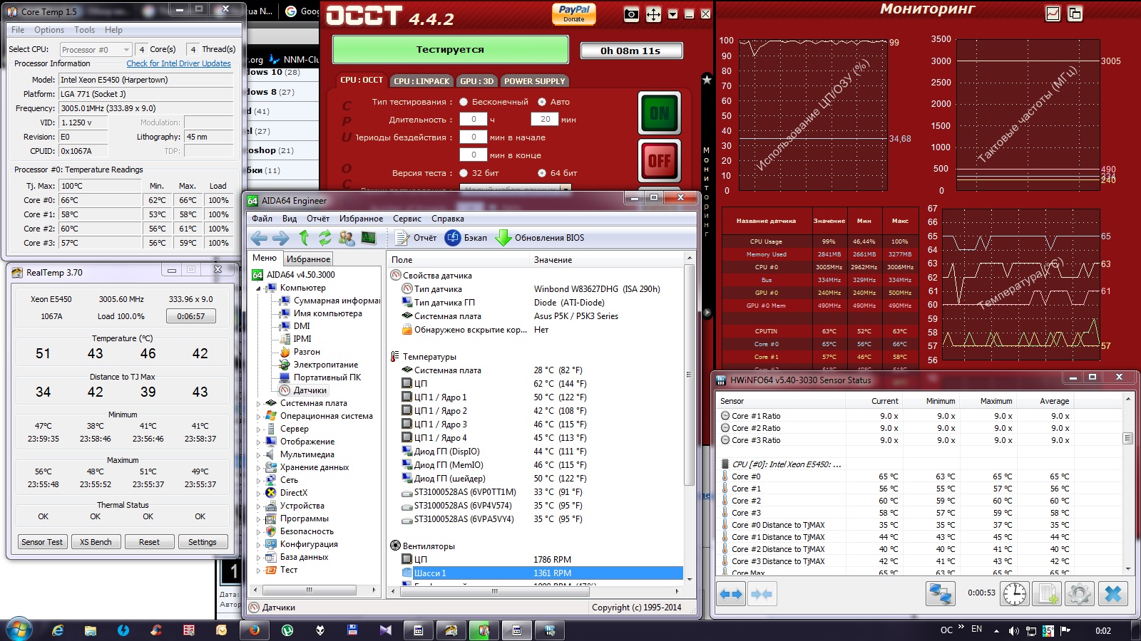Добрый день. Процессор Xeon E5450, МП P5K-Premium, Zalman CNPS9500A LED. Процессор при тестах греется на ядрах до 66 градусов на стоке. При разгоне до 3,3 Ггц температура 70-73. Хотя если потрогать основание радиатора, то оно и не то что горячее, даже и не теплое. Планирую разгонять на 4 Ггц. Возможна погрешность датчиков температуры? Или все таки старичок залман уже не справляется? Кому верить в показаниях температуры Realtemp, Core Temp, HWinfo, AIDA?